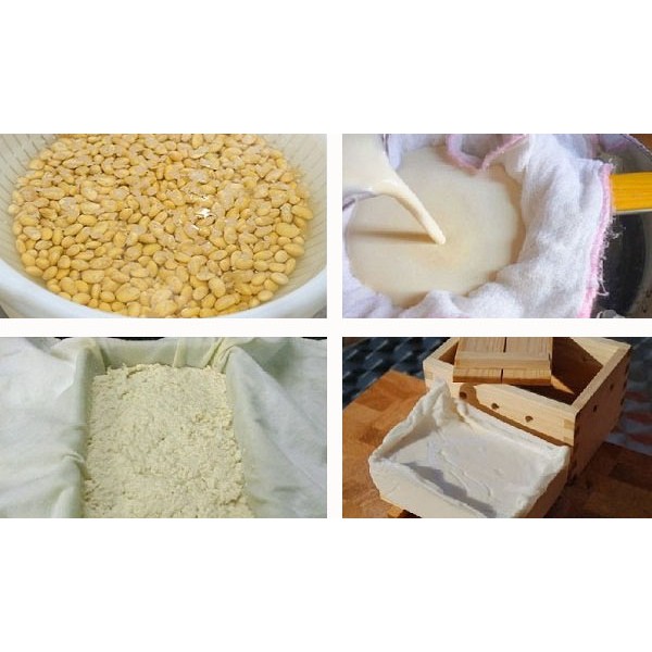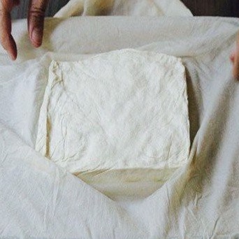 Đậu sau khi kết tủa và tách nước vẫn còn nóng hổi được xúc ra và đổ vào khuôn đậu phụ (khuôn đã được lót sẵn khăn bên dưới). Bạn gấp các mép khăn vuông vắn để miếng đậu đẹp và phẳng hơn, và bắt đầu ép đậu phụ.Đậu được gói trong chiếc khăn gói đậu này sẽ vào khuôn một cách vuông vắn, không bám dính và nhanh ráo nước.