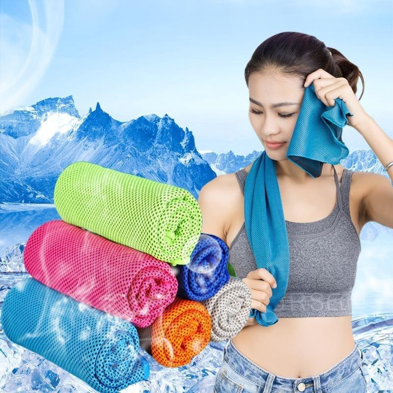 - Khăn thể thao mát lạnh có thể giải quyết tất cả khó chịu trên. Khác với các loại vải thông thường, Khăn thể thao siêu thấm được làm bằng chất liệu đặc biệt PVA/PVF, chỉ cần ngâm khăn trong nước và vắt nhẹ, sau đó choàng lên cổ hoặc trán, bạn sẽ có cảm giác sảng khoái như ngâm mình trong làn nước mát lạnh.