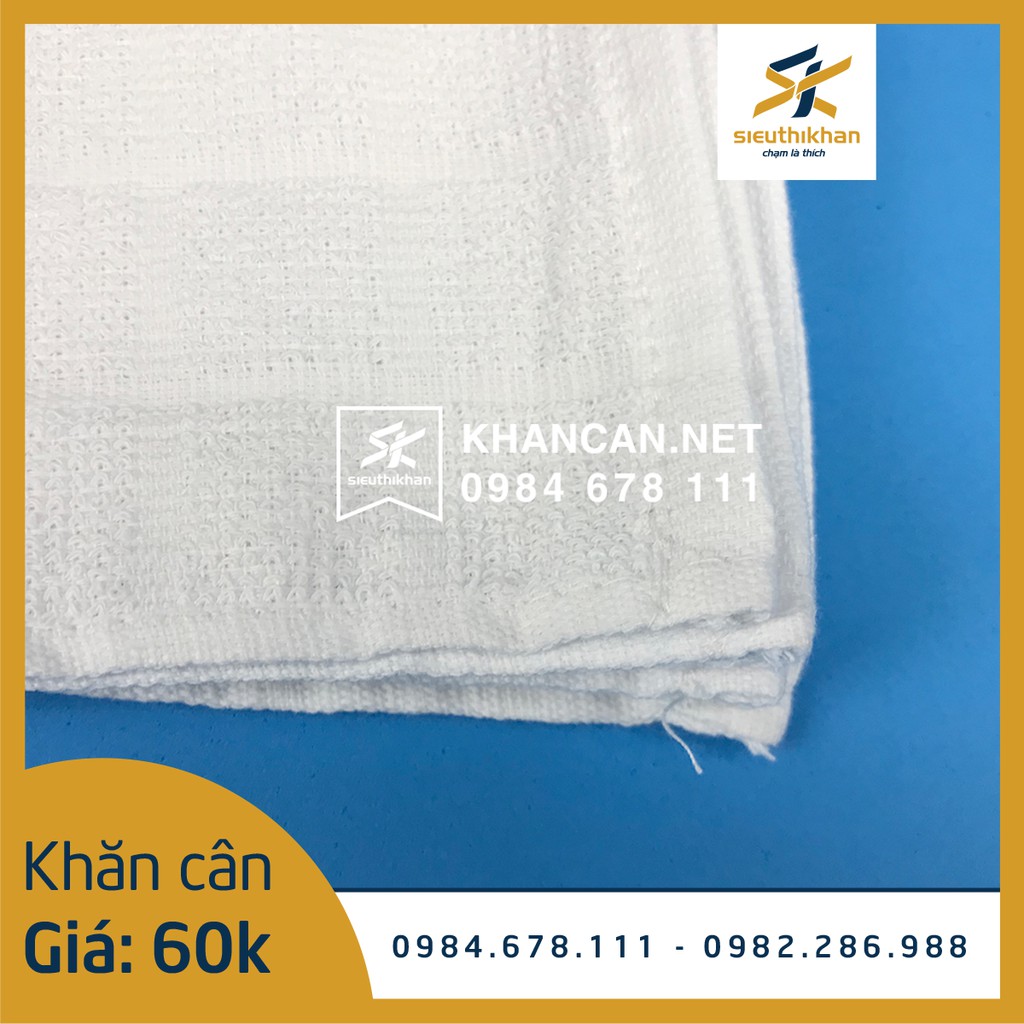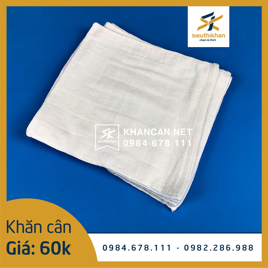 Khăn lau cân màu trắng kích thước 25x25cm, thấm hút nước nhanh.Một cân khăn khoảng 65 chiếc với họa tiết hình ô vuông nhỏ.