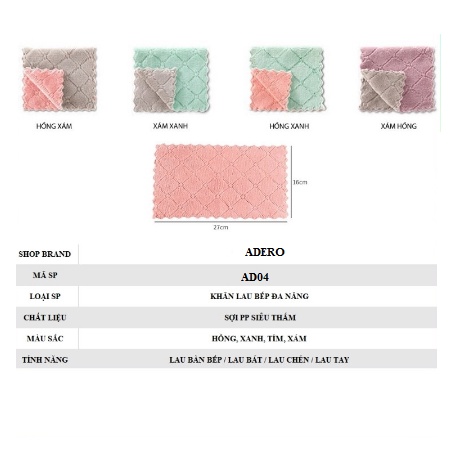 Khăn Lau Bếp Đa Năng Siêu Thấm 2 Mặt Có Thể Tái Sử Dụng Nhiều Lần ADERO AD4Khăn lau bếp và nội thất đa năng giúp bạn làm sạch các vết bẩn trên bếp, bàn ăn nhanh chóng. Sản phẩm dùng được trên mọi bề mặt như bàn kiếng, cửa kiếng, bề mặt bếp gas và tủ lạnh, lò vi sóng, máy giặt.