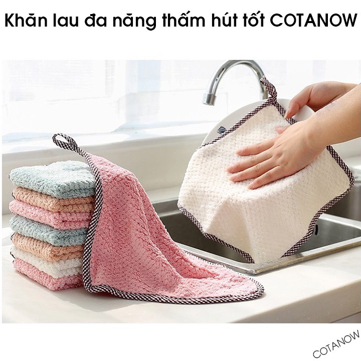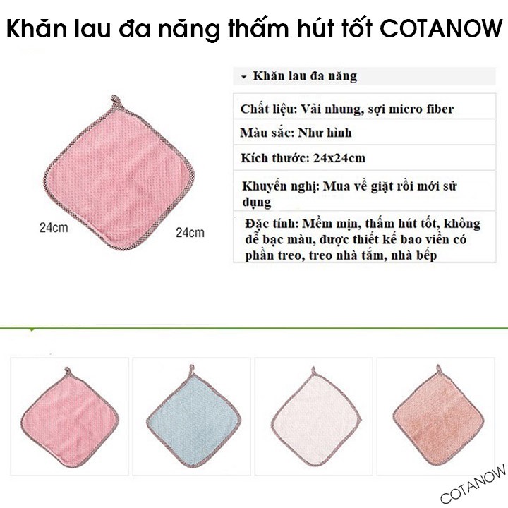 Khăn Lau Bếp Đa Năng Thấm Hút Nước Tốt 24x24cm Có Móc Treo COTANOWKhăn lau bếp đa năng được làm từ vải nhung, đường may chắc chắn, sợi micro fiber thấm hút tốt, dễ vệ sinh.