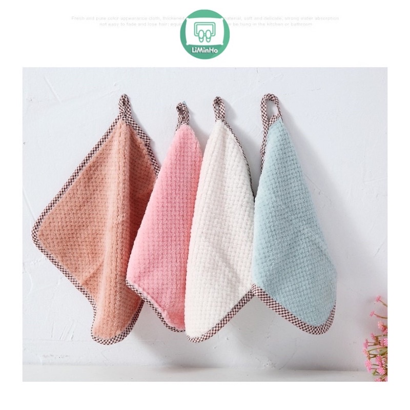 - Đặc tính: Mềm mịn, thấm hút tốt, không dễ bạc màu, được thiết kế bao viền có phần treo, có thể treo ở nhà tắm, nhà bếp.