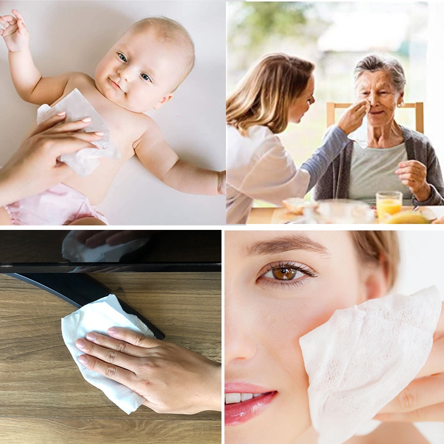 - Công dụng: Dùng làm khăn lau mặt, vệ sinh cá nhân tẩy trang, vệ sinh cho bé, vệ sinh dụng cụ thiết bị trong gia đình,...
