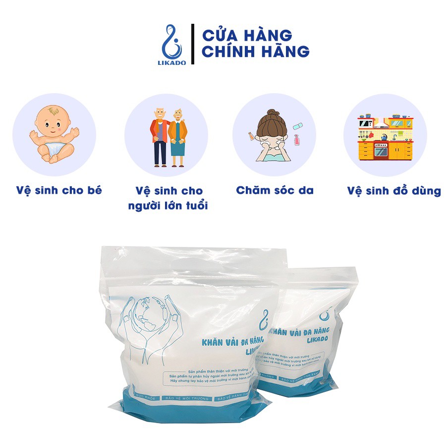 - Công dụng: Khăn lau mặt dùng 1 lần likado dùng làm khăn lau mặt, vệ sinh cá nhân tẩy trang, vệ sinh cho bé, vệ sinh dụng cụ thiết bị trong gia đình,...