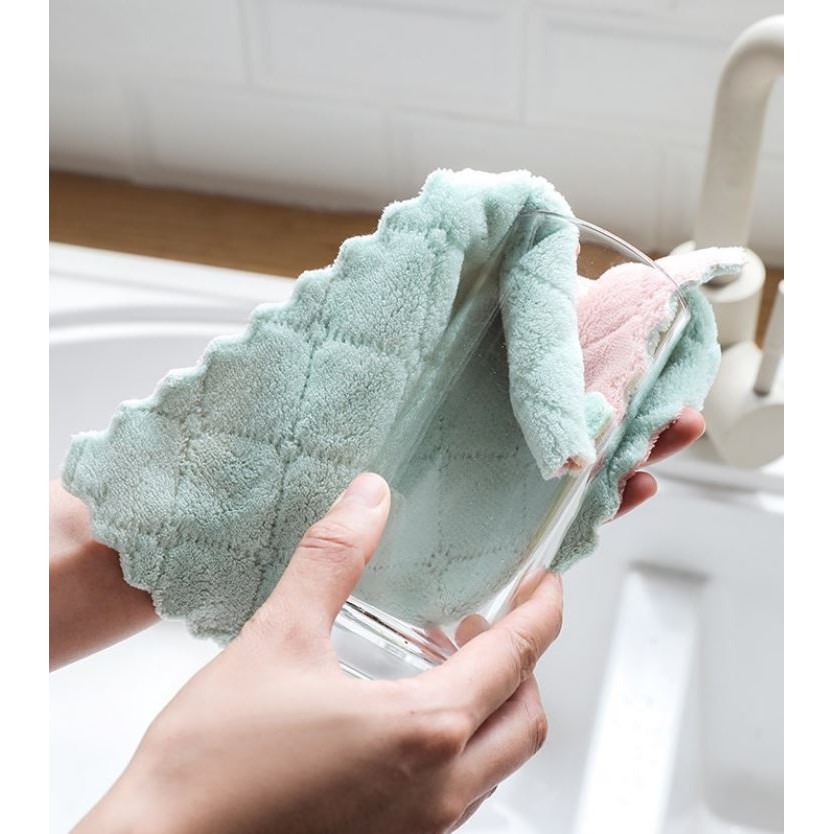 - Khăn lau nhà bếp với thiết kế 2 mặt sang trọng, sợi bông thấm hút tốt, giúp lau sạch các vết bẩn trong nhà bếp, bàn ghế hay dùng lau chén bát, ly tách... thật khô ráo, sạch sẽ mà không để lại bất kì vết trầy xước nào.