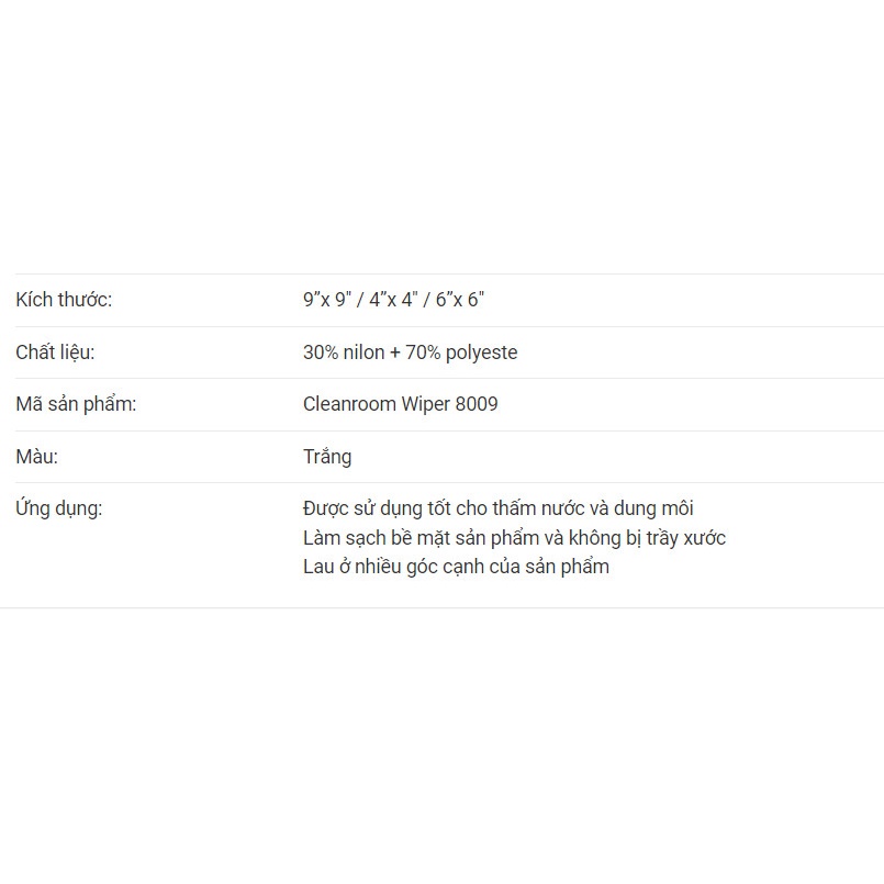 Khăn lau phòng sạch 8009 có khả năng chống tĩnh điện, được dùng thường xuyên trong sản xuất linh kiện, phòng thí nghiệm,.. do yêu cầu về độ sạch của môi trường làm việc.📌 Thông tin chung Khăn lau phòng sạch 8009: