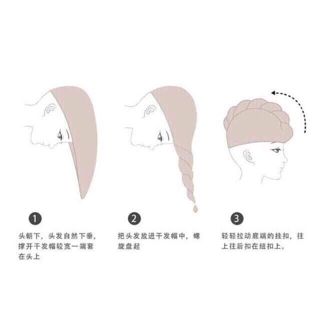 B1: Cúi đầu xuống để tóc rũ tự nhiên.B2: Trùm khăn lên khít đầu, sao cho khăn ôm sát lấy tóc.