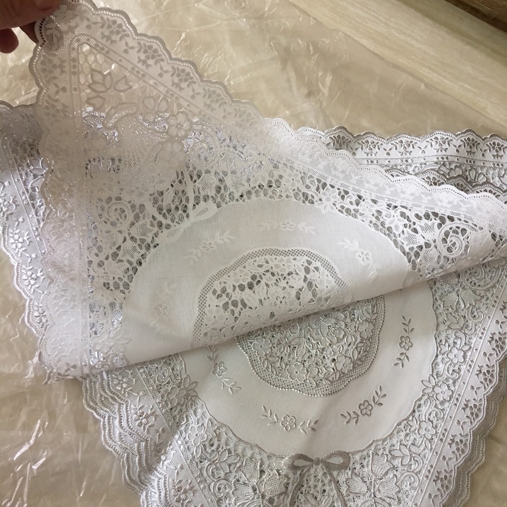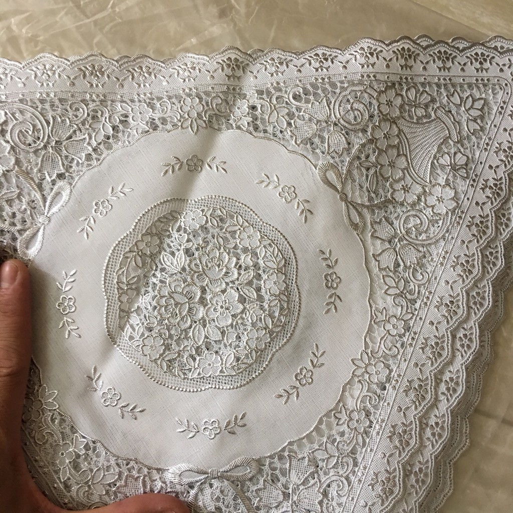 - Khăn có hình tam giác khá đơn giản nhưng vô cùng bắt mắt nhờ họa tiết thanh lịch, được phủ nhũ bạc, nổi bật trên nền trắng. Sản phẩm mang đến vẻ trang nhã, sang trọng cho không gian gia đình.