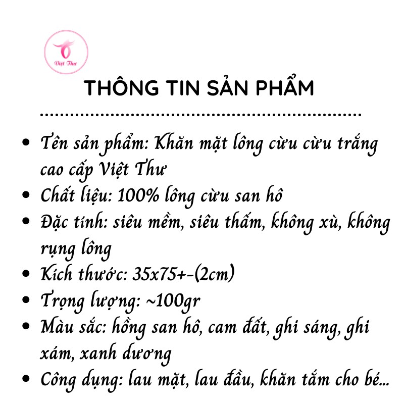 - Màu sắc của khăn luôn là điều bạn quan tâm, thấu hiểu băn khoăn đó mỗi chiếc khăn tại Việt Thư luôn được sản xuất với tiêu chí màu nhuộm an toàn và tự nhiên, không bị phai màu hay rụng lông, đó là sự cam kết hướng tới hài lòng ngay cả những bạn khách khó tính nhất khi tới với Việt Thư