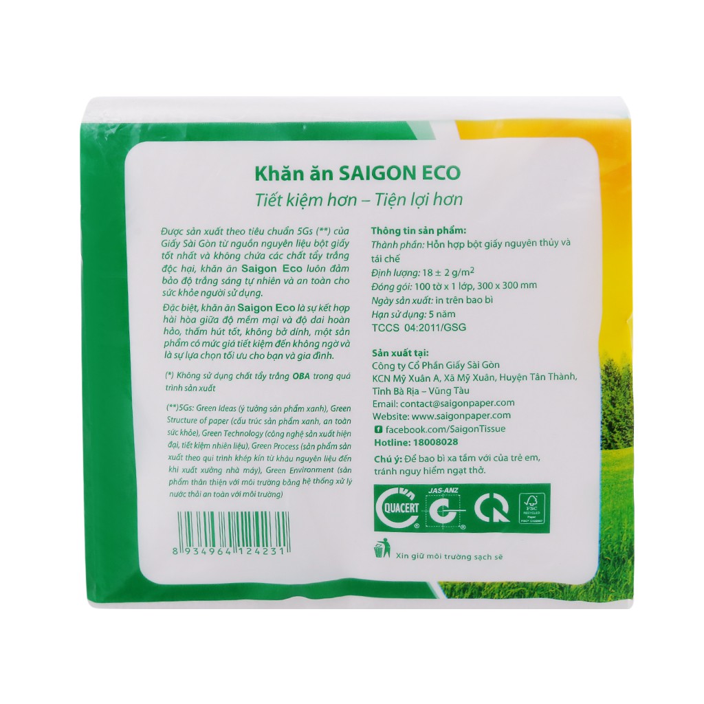 Khăn Giấy Ăn Napkin eco (30x30) - Giấy ăn từ lâu đã trở thành một sản phẩm tiện ích trong cuộc sống hàng ngày của chúng ta, xuất hiện rất phổ biến trong các quán ăn, nhà hàng hay các buổi đi chơi, dã ngoại... Khăn Giấy Ăn Napkin eco được làm từ 100% bột giấy nguyên chất, đảm bảo chất lượng và mang đến cho bạn loại giấy dai, mềm mại, mịn màng, đáp ứng nhu cầu sử dụng cho cả những làn da nhạy cảm.Khăn Giấy Ăn Nakin eco được làm từ bột giấy nguyên chất 100%, kết hợp với dây chuyền sản xuất khép kín đạt tiêu chuẩn an toàn tại Việt Nam, đã cho ra đời loại giấy ăn trắng, dai, mềm mịn.