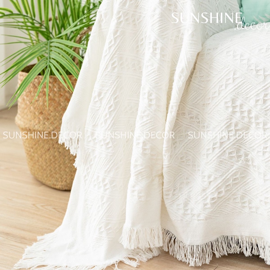Khăn phủ sofa, chăn trải ghế sofa có tua rua màu trắng phong cách Bắc Âu