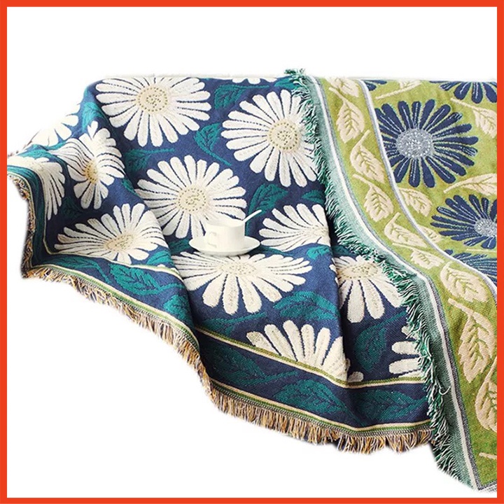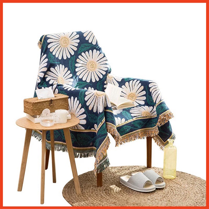 Sự kết hợp giữa hoa cúc vàng trên nền xanh vô cùng cổ điển mà rất sang trọng, chất liêu bông dệt kim khi sờ vào khiến bạn cảm thấy vô cùng mềm mịn, thoải mái.Sản phẩm có thể sử dụng với nhiều công dụng khác nhau như làm khăn sofa, thảm trải sàn, khăn trải bàn, chăn đắp... Và dù dùng cho mục đích nào đi chăng nữa cũng khiến bạn thấy dễ chịu, vừa thoáng khí nhưng cũng vô cùng ấm áp.
