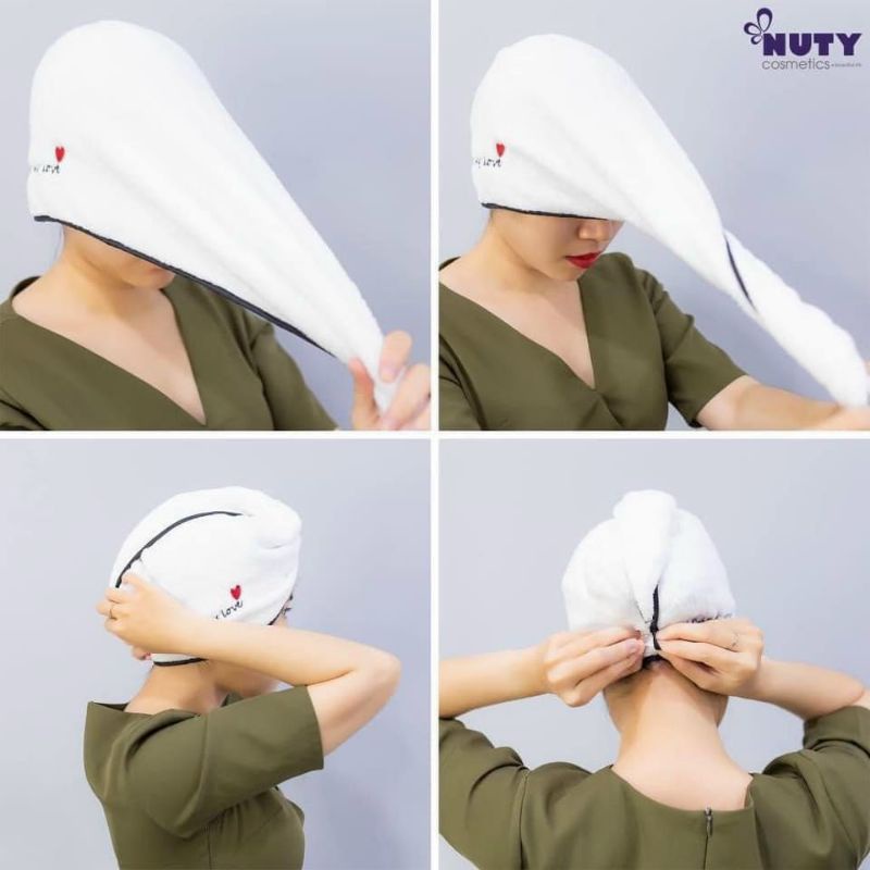 Khăn được thiết kế hình mũ ôm sát đầu và có nút cài tháo dễ dàng, nên rất dễ sử dụng