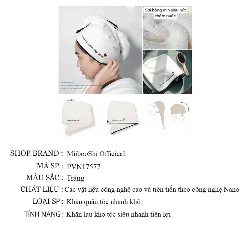 Giới thiệu Khăn quấn tóc nhanh khô siêu thấm có nút cài mềm mịn thấm hút tốt MiibooShi PVN17577