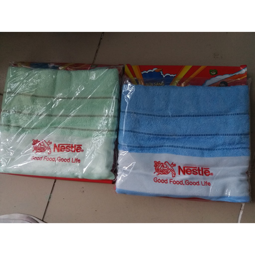 Chất liệu 100% cotton, thương hiệu Best Comfort, quà từ Nestle, có hộpcó 2 màu màu xanh ngọc và xanh biển,