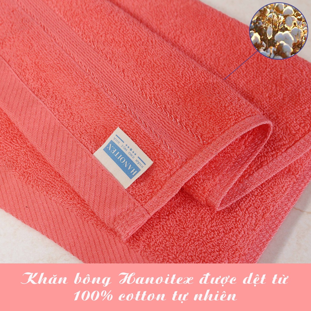- Khăn bông Hanoitex được dệt từ 100% cotton dày dặn, mềm mại, thấm nước rất tốt