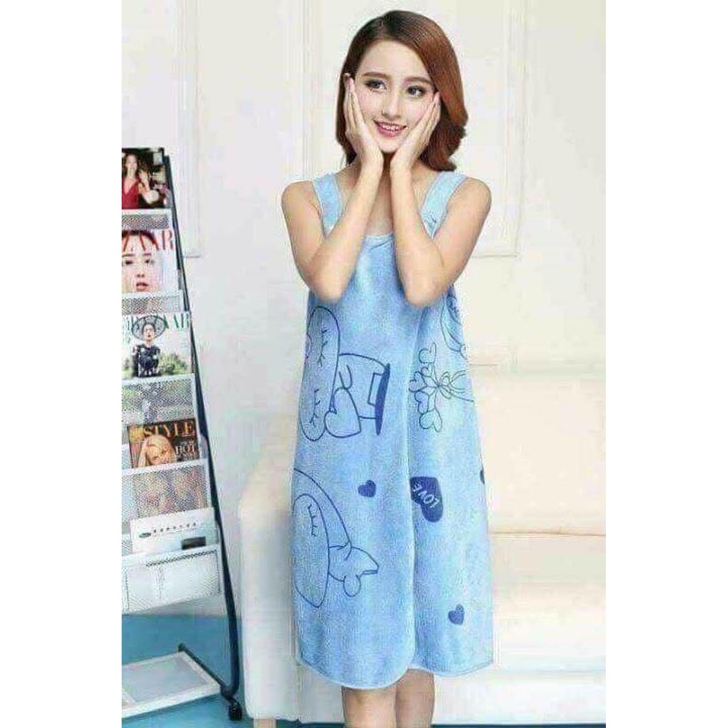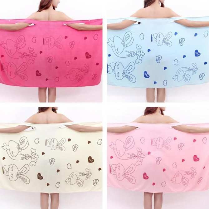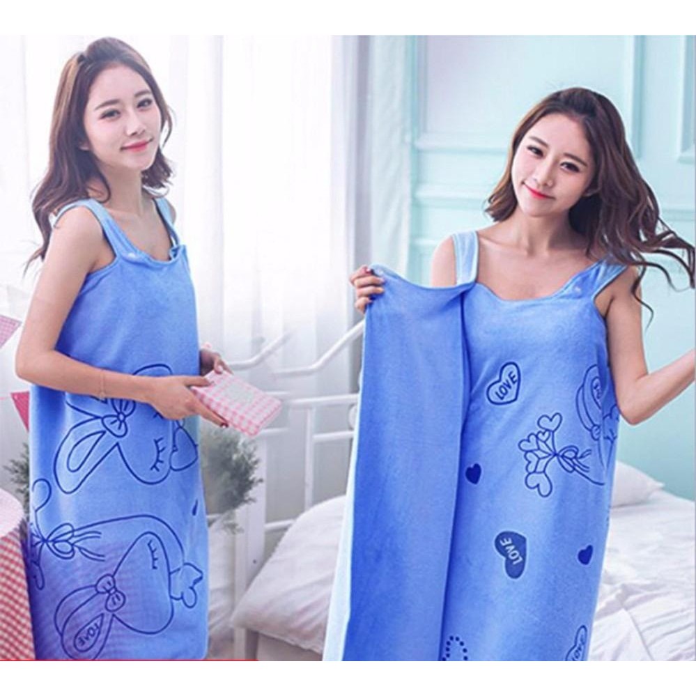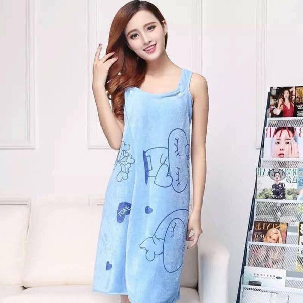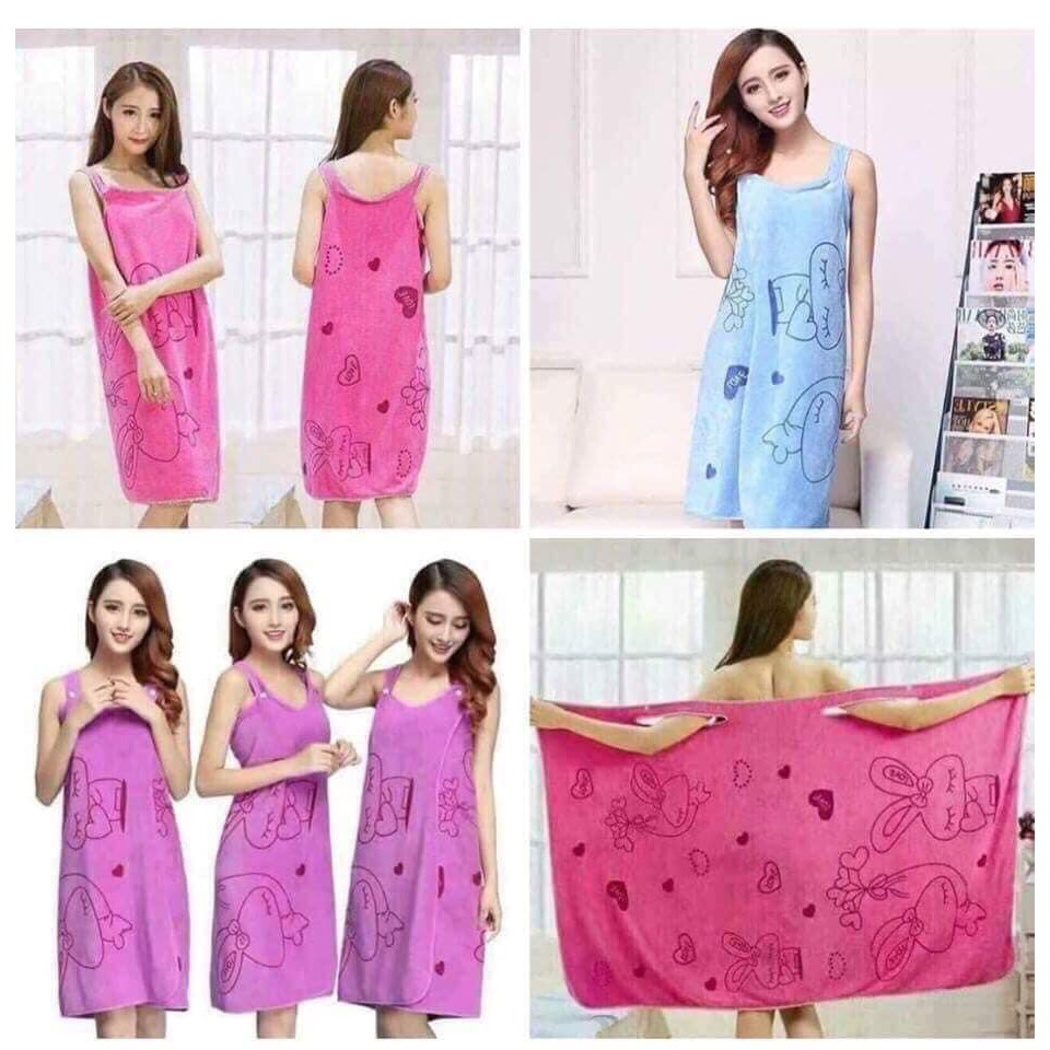 Khăn được thiết kế như một trang phục mặc nhà đơn giản, thuận tiện lau khô đầu tóc, quấn cơ thể sau khi tắm.
