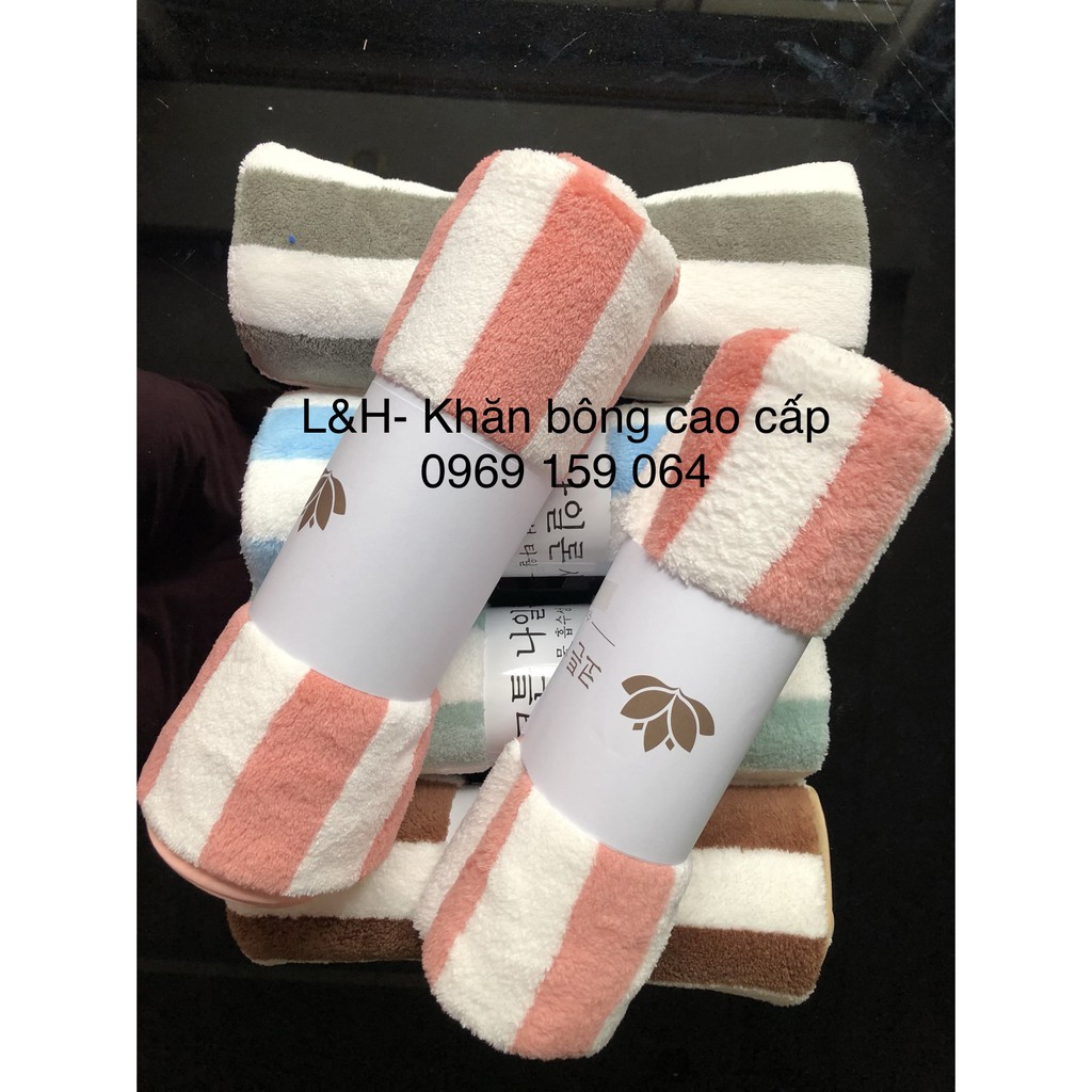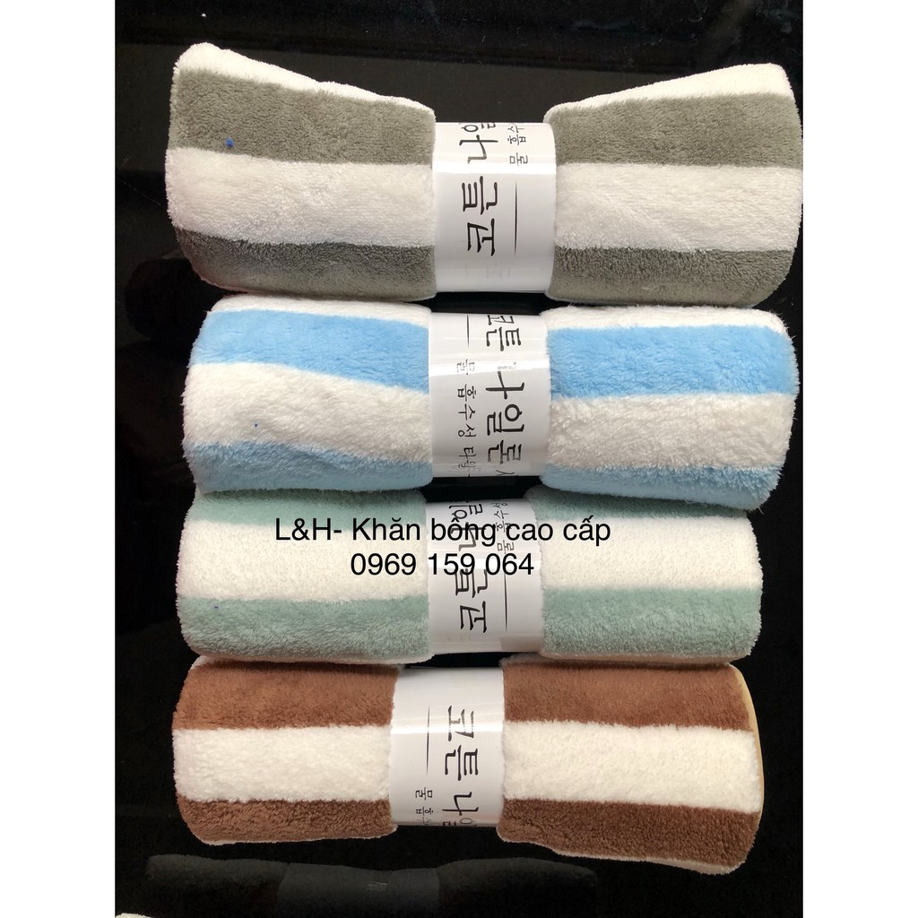 - Khăn Mặt Lông Cừu Xuất Hàn Vân Kẻ Sọc từ chất liệu sợi vải bông mềm mịn, siêu mềm, không bị xù lông, không phai màu