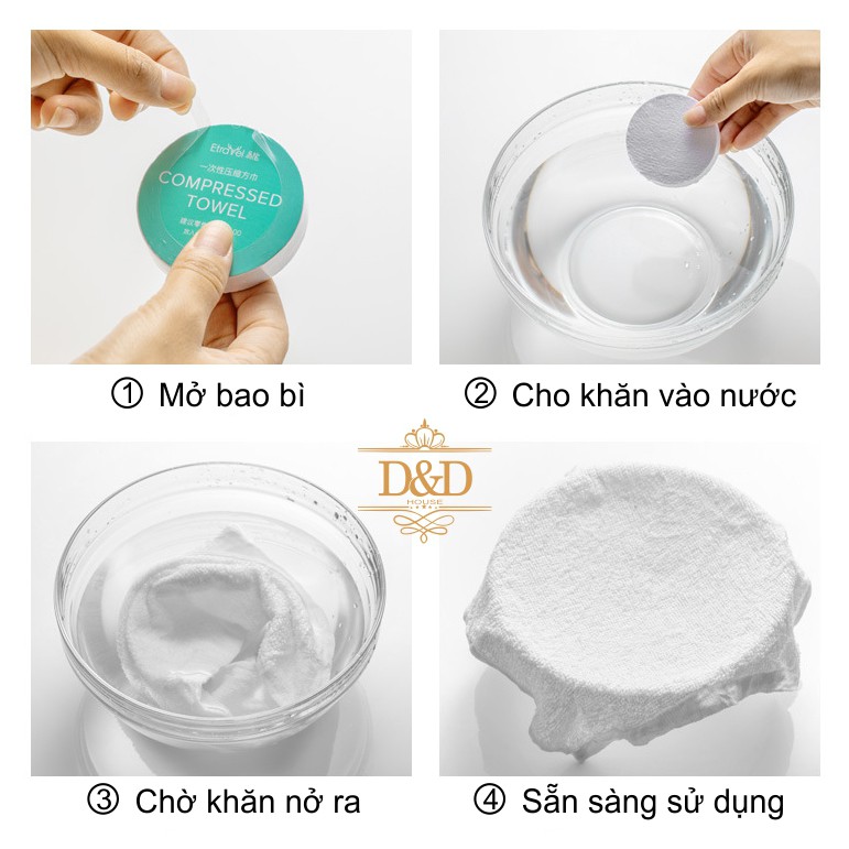 - Cách sử dụng đơn giản: mở bao bì bên ngoài, cho khăn vào nước khăn sẽ nở ra (HOẶC KHÔNG CẦN DÙNG NƯỚC) và sẵn sàng để sử dụng, dùng 1 lần.