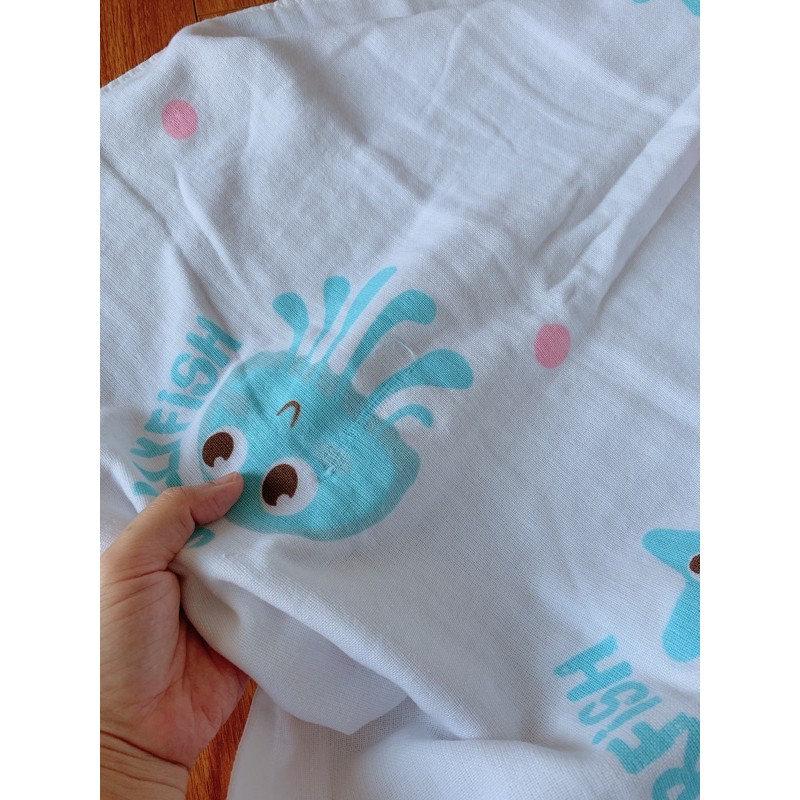 - Chất liệu: 100% cotton, 2 lớp: 1 mặt vải xô (giống khăn sữa em bé) + 1 mặt vải bông giống khăn tắm.