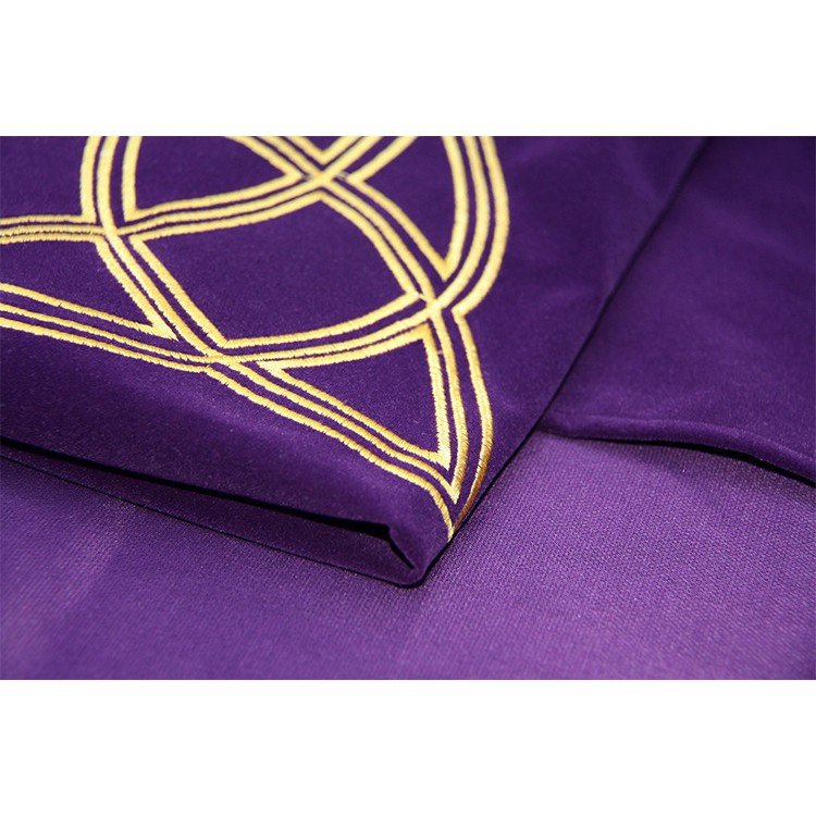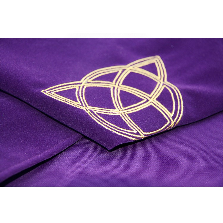 Chất liệu khăn được may từ vải nhung và tông màu tìm sang trọng và mềm mại, cùng biểu tượng huyền bí Triquetra cách điệu.