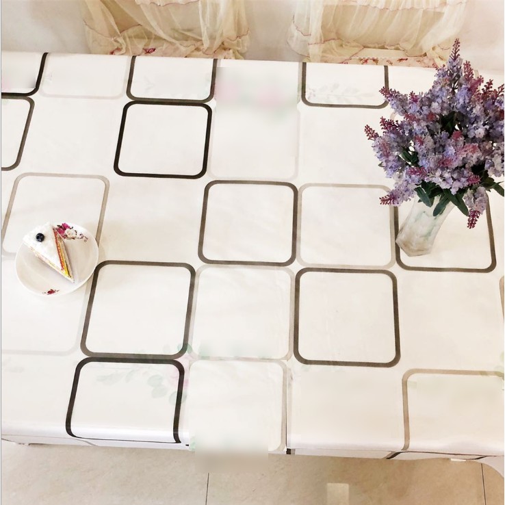 ** Chất liệu: Nhựa PVC dai, bền. KHĂN CHẤT LIỆU MỜ TRONG, KHÔNG CHE KÍN ĐƯỢC NỀN MẶT BÀN