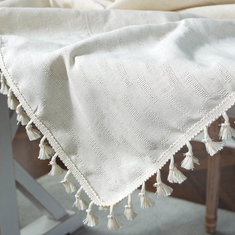 Khăn Trải Bàn Dệt Slub Jacquard Vải Cotton Viền Tua Rua Màu Trắng