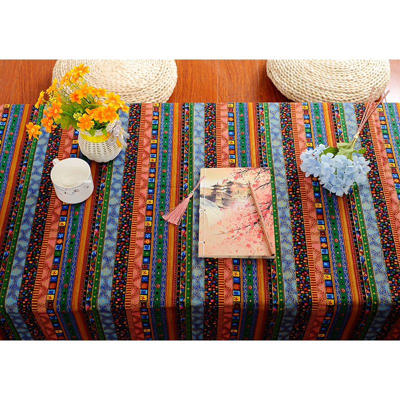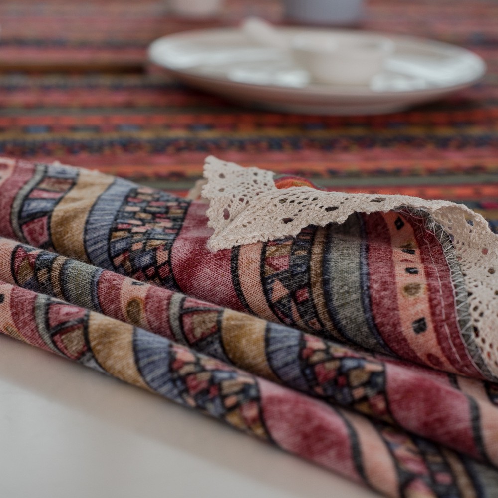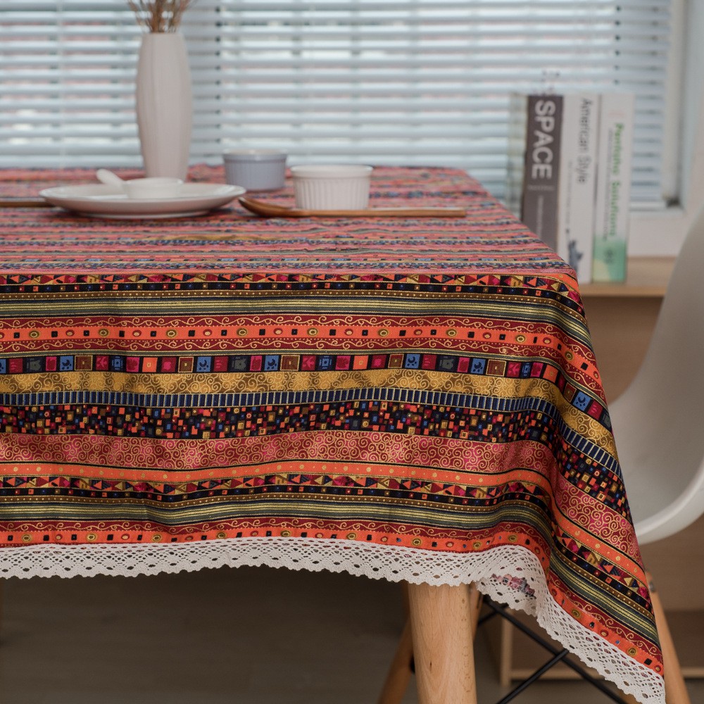 Khăn Trải Bàn Hình Học Bronzing Sọc Cotton Bố Gai Viền Ren Tua Rua