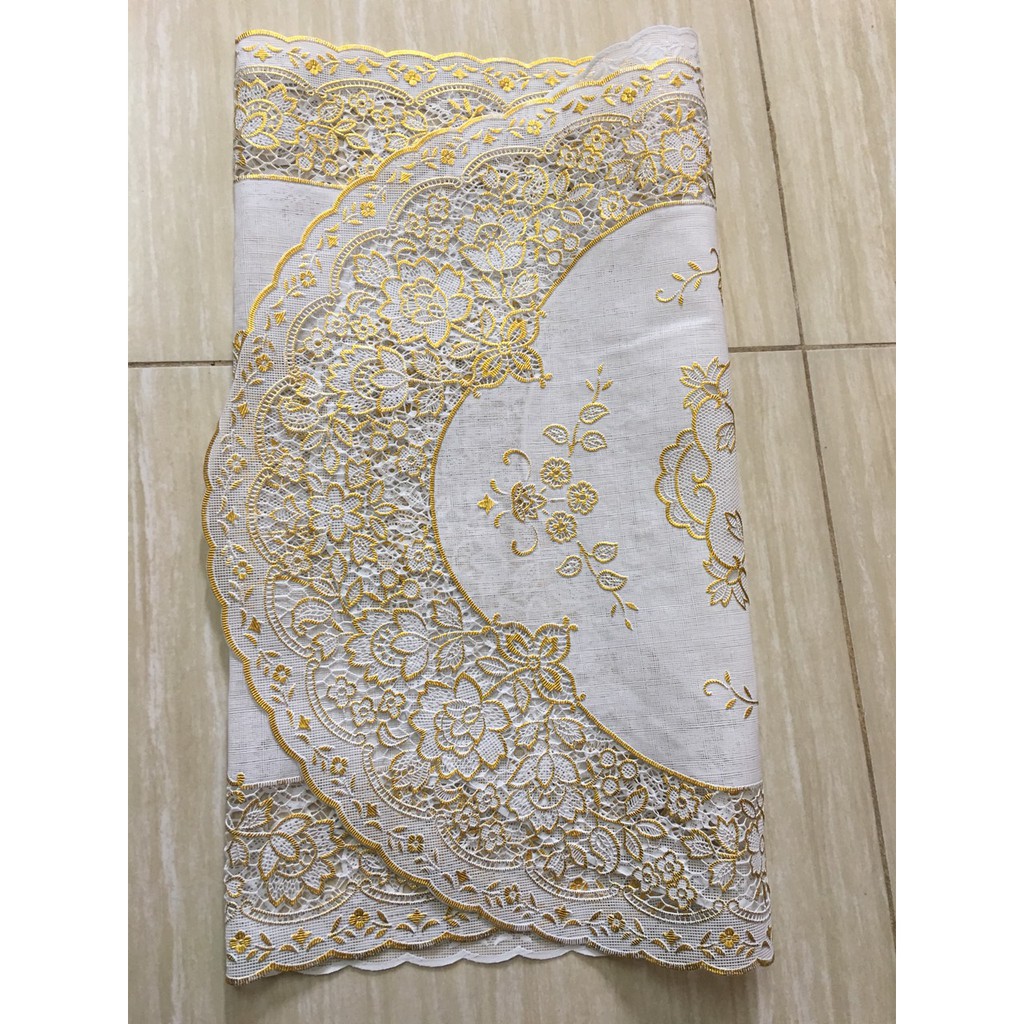 - Khăn bàn có hình oval đơn giản nhưng vô cùng bắt mắt nhờ họa tiết hoa trang nhã được phủ nhũ vàng, nổi bật trên nền trắng, góp phần tô điểm cho chiếc bàn xinh xắn của gia đình bạn.