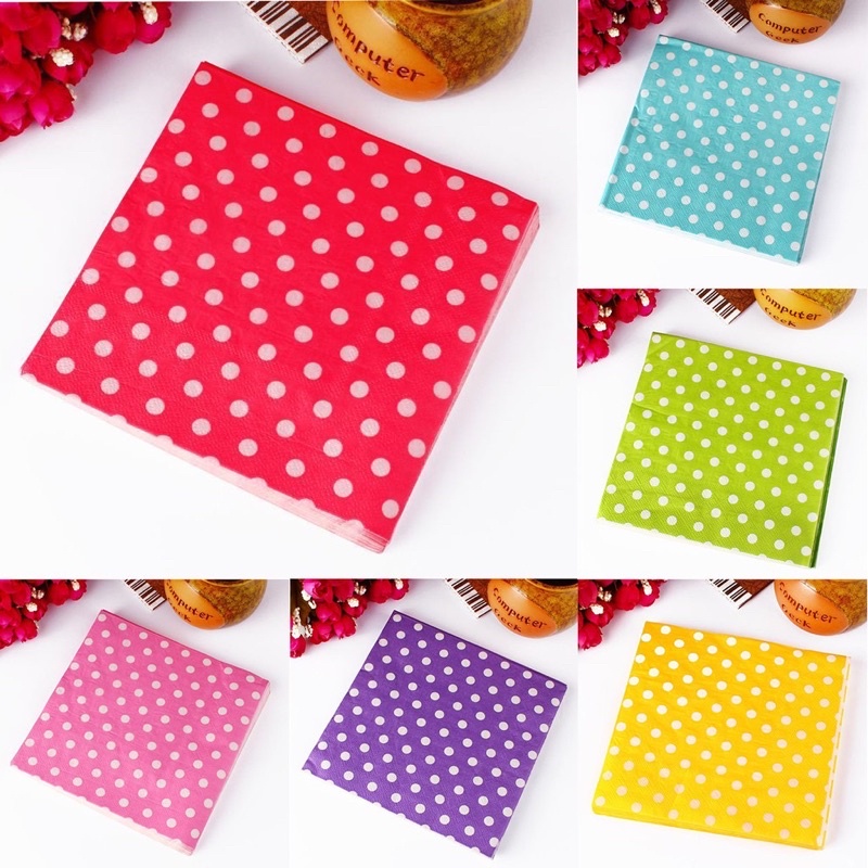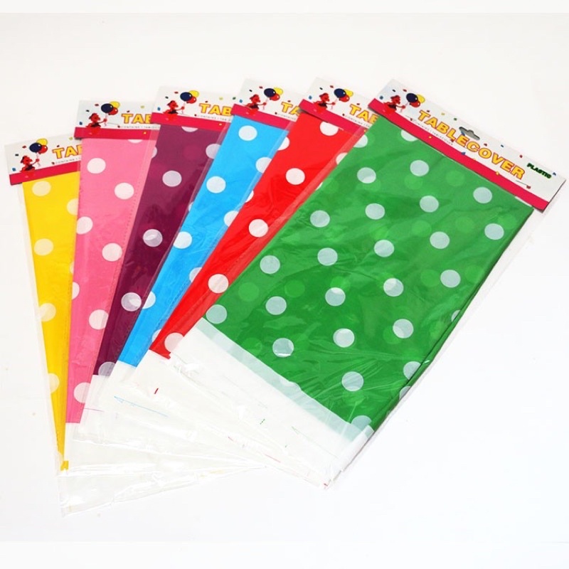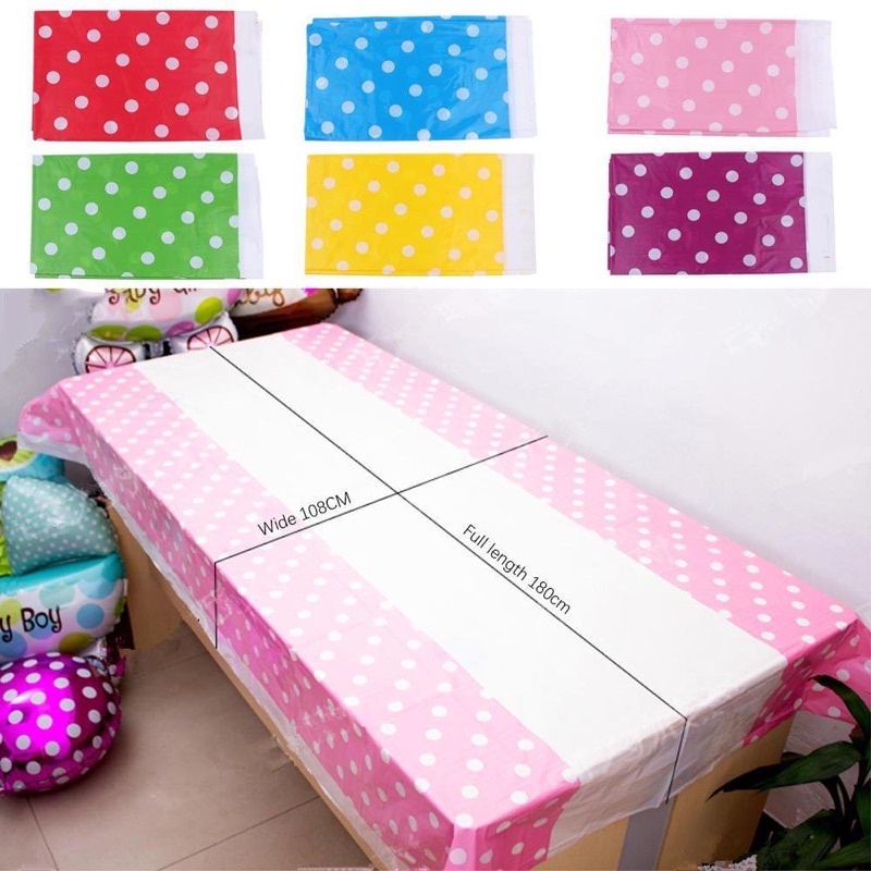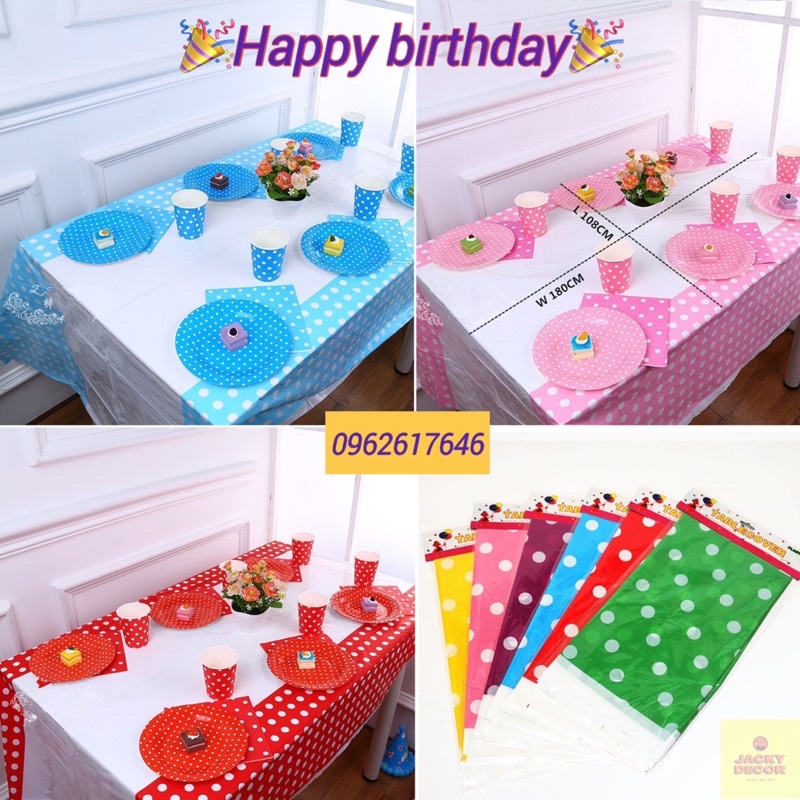 - Loại khăn bàn nhiều màu hoạt tiết chấm bi chất liệu nilon kích thước: 1m3x1m8 phủ kín mặt bàn