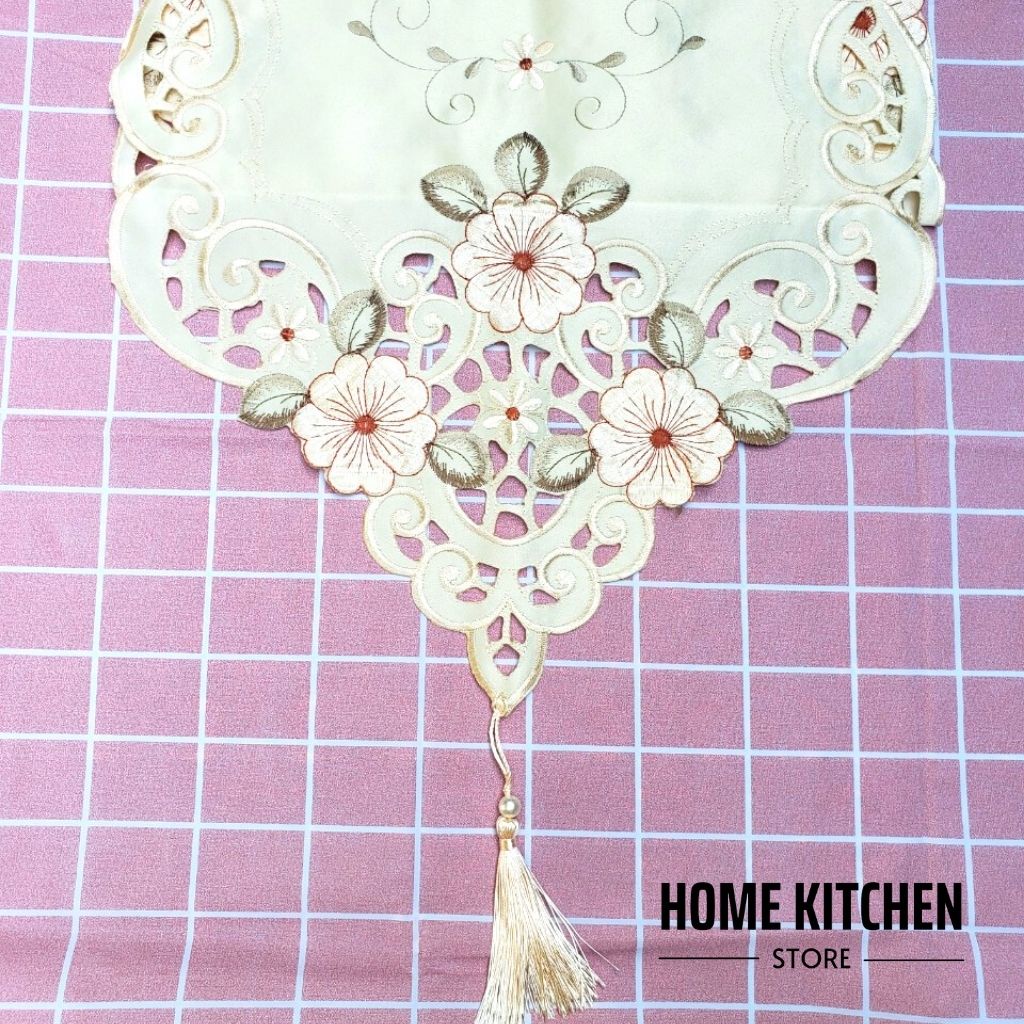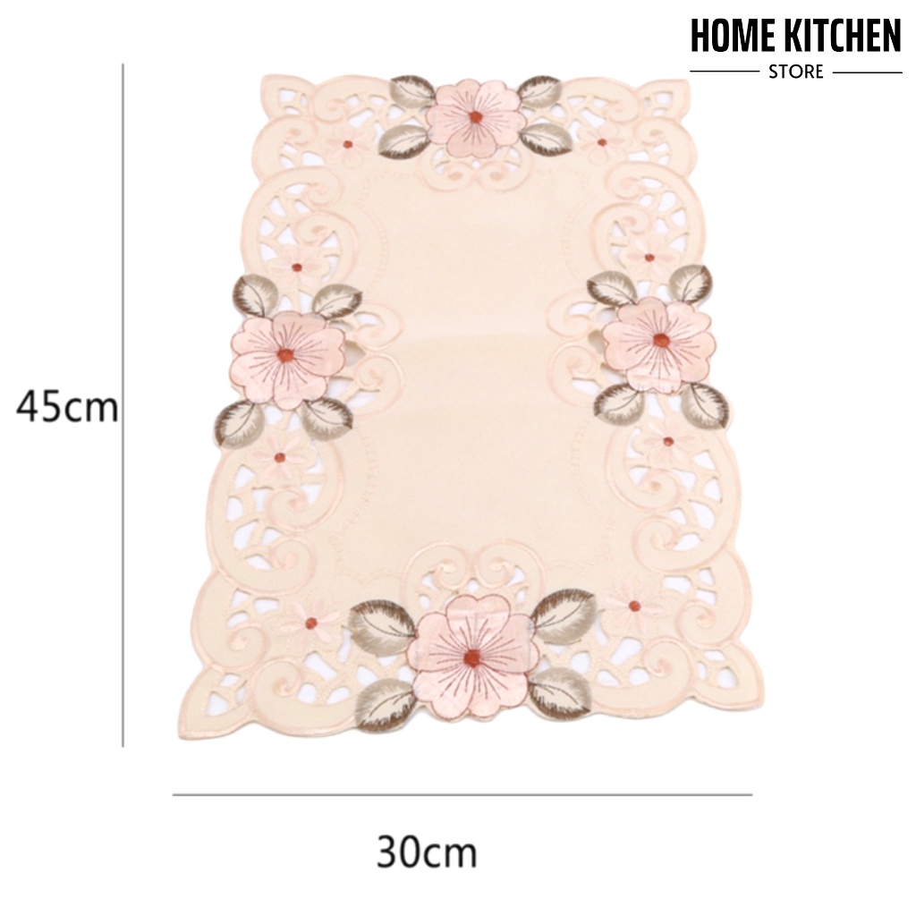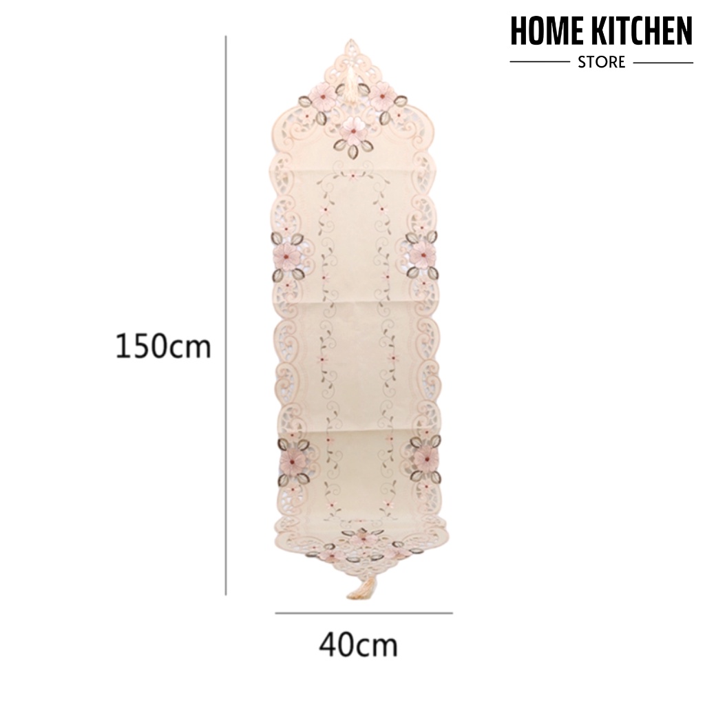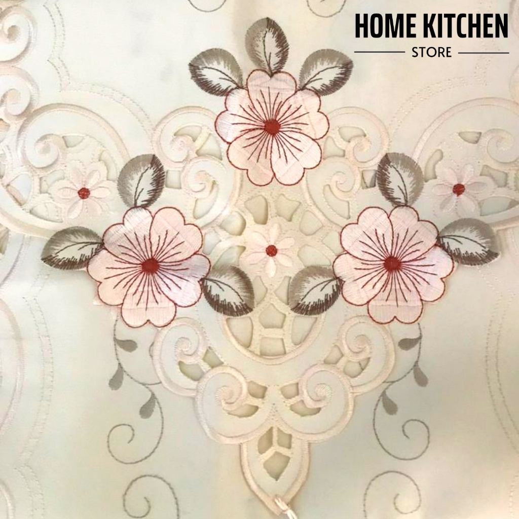 - Chất liệu vải cao cấp, mặt trên có độ bóng tạo sự sang trọng, thêu bông hoa xung quanh, từng vị trí bông hoa đều được xử lý tỉ mỉ, chi tiết. Riêng mẫu khăn trải bàn dài có thêm hạt châu và tua rua ở hai đầu.