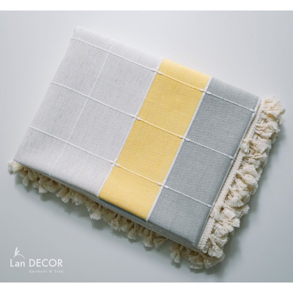 Giới thiệu Khăn trải bàn trà sợi dệt cao cấp mẫu sọc giữa vàng, xám, trắng, xanh sang trọng Landecor - TBT469