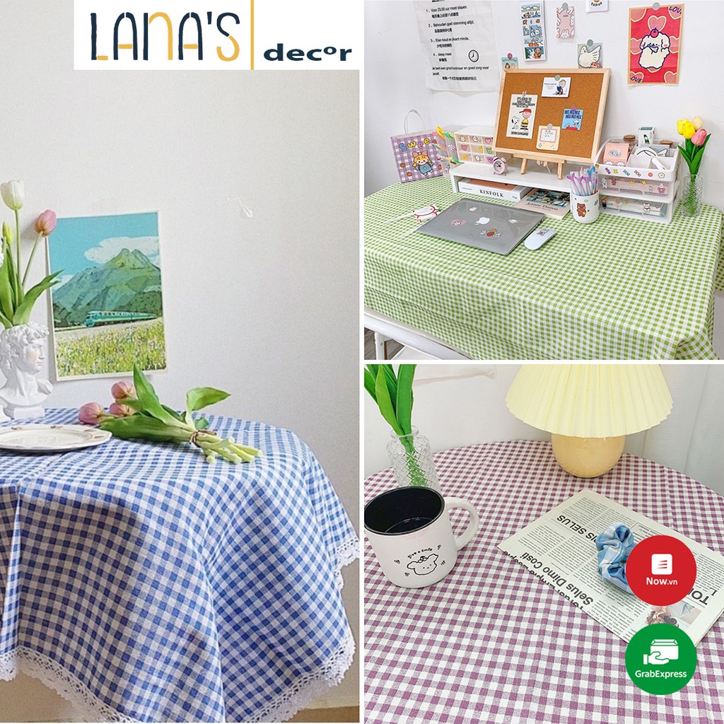 Giới thiệu Khăn Trải Bàn Vải Canvas Caro Nhiều Màu Caro Xanh, Caro Tím Viền Ren Phong Cách Hàn Quốc
