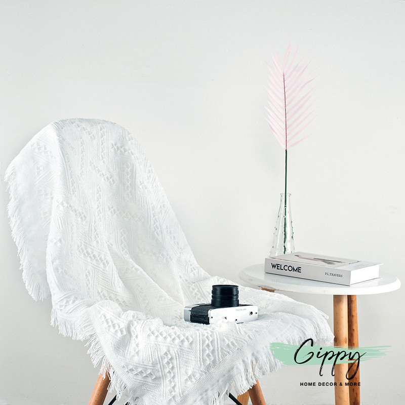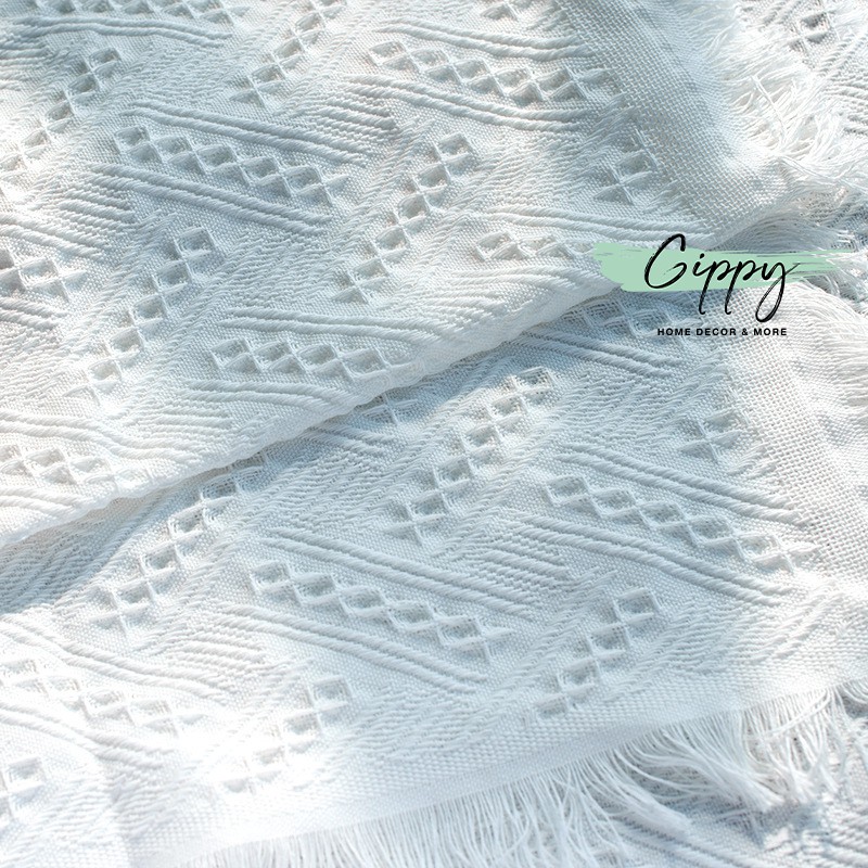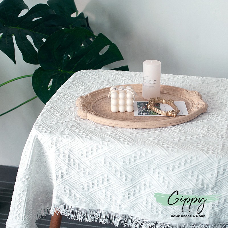 Khăn trải bàn vải ren trắng mềm mịn, viền tua rua - phụ kiện trang trí - Gippy Decor