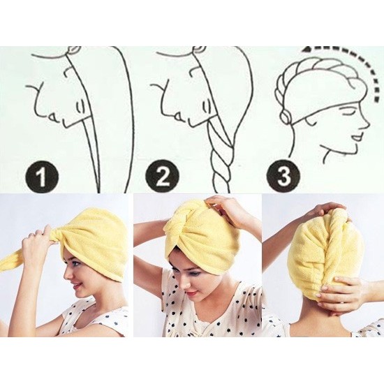 Làm ráo tóc bằng khăn bông trước - sản phẩm khăn trùm đầu giúp tóc khô dần mà không phải sấy hạn chế hư tổn cho tóc và tránh cảm.