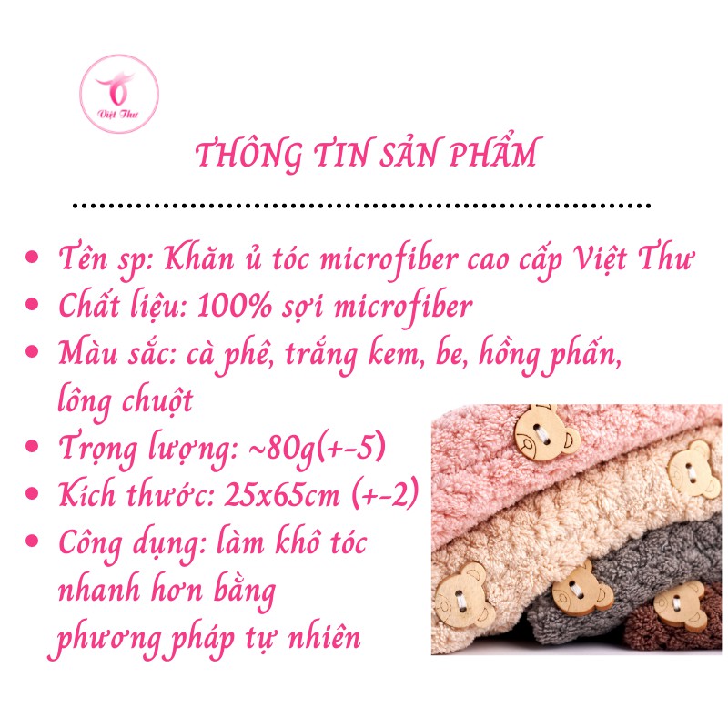 - Tên sản phẩm: Khăn ủ tóc nhanh khô, khăn quấn tóc Microfiber 1 lớp dày, siêu mềm, siêu thấm Việt Thư