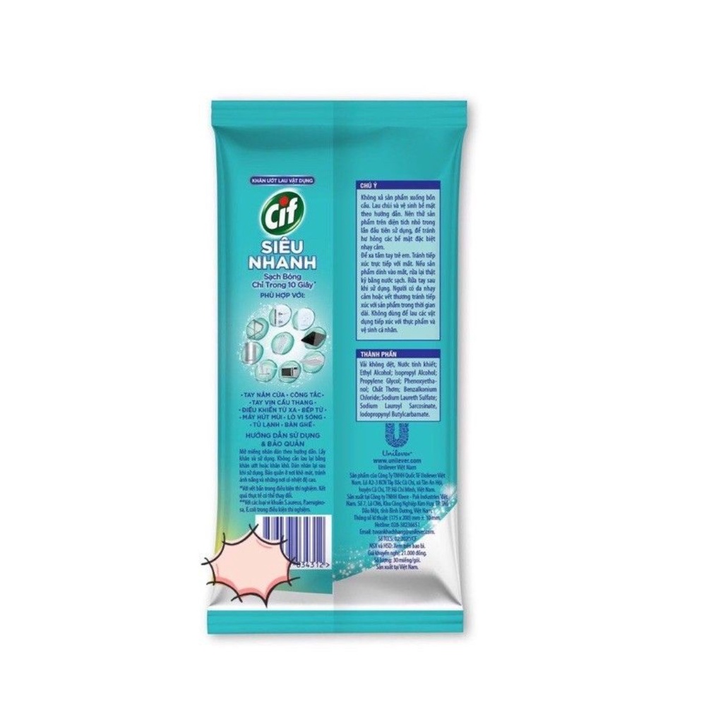 Khăn Ướt Lau Vật Dụng Cif Siêu Nhanh sẽ giúp bạn vệ sinh các vật dụng trong nhà thật hiệu quả và tiện lợi, đem lại vẻ sạch bóng như mới và loại bỏ 99,9% vi khuẩn* cho các bề mặt một cách nhanh chóng, với hương chanh tươi thơm mát. Vệ sinh nhà cửa hiệu quả & tiện lợi: Dễ dàng loại bỏ các vết bẩn, vết ố, bụi bám chỉ sau 1 lần sử dụng Làm sạch trên nhiều bề mặt & vật dụng: Sản phẩm hoạt động hiệu quả trên nhiều bề mặt & vật dụng: tay nắm cửa, công tắc, bếp từ, máy hút mùi, điều khiển từ xa, máy lạnh, bàn ghế,... Loại bỏ 99,9% vi khuẩn*: Với công thức Benzalkonium Chlorine có khả năng loại bỏ 99,9% vi khuẩn*, được viện Pasteur TP.HCM Kiểm Nghiệm và chứng nhận Hương chanh tươi thơm mát Với hương thơm nhẹ nhàng, sản phẩm mang lại cảm giác thoải mái, dễ chịu cho người sử dụng. Hướng dẫn sử dụng: Mở miếng nhãn dán theo hướng dẫn Lấy khăn và sử dụng Không cần lau lại bằng khăn ướt hoặc khăn khô Dán nhãn lại sau khi sử dụngGiá SLX