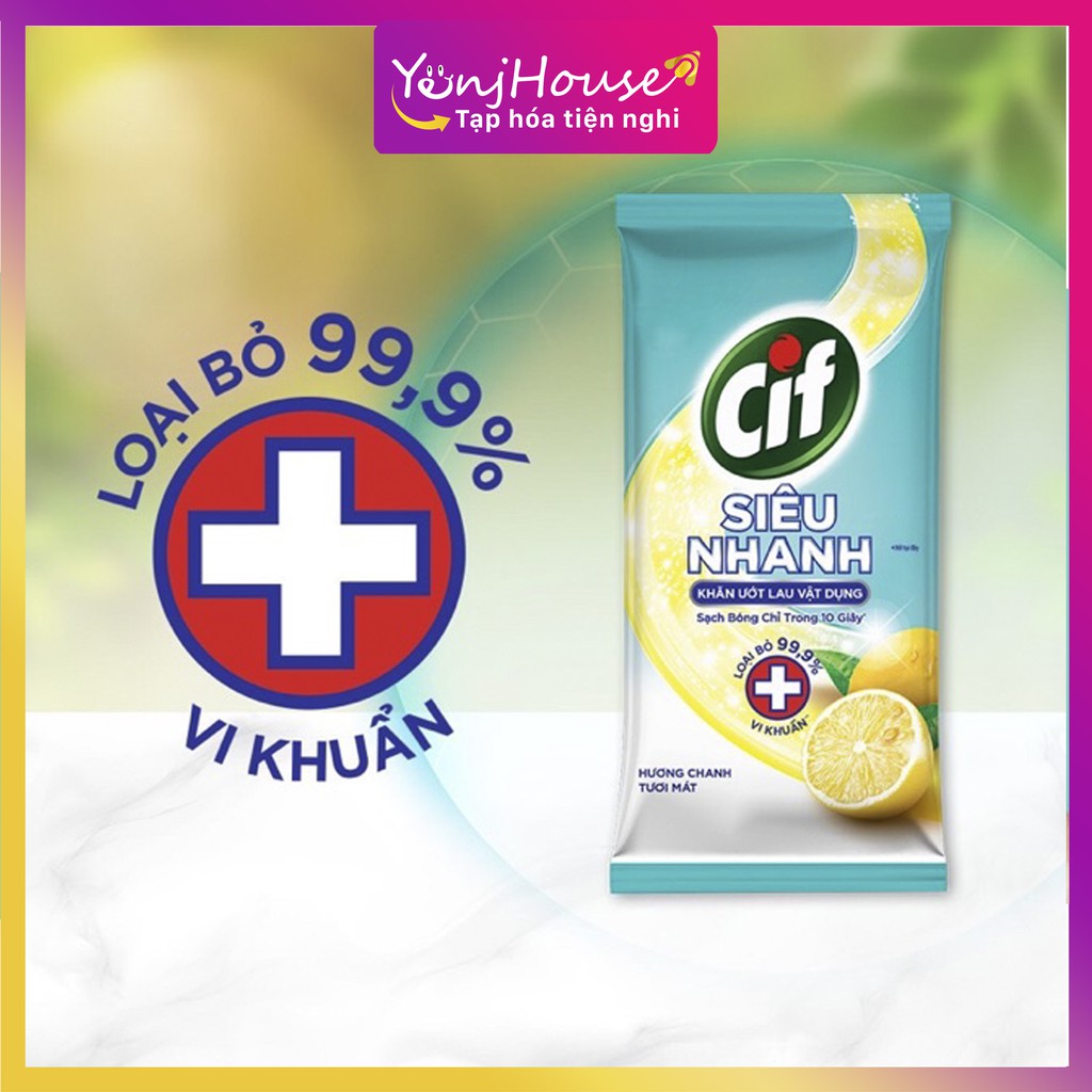 Khăn Ướt Lau Vật Dụng Cif Siêu Nhanh sẽ giúp bạn vệ sinh các vật dụng trong nhà thật hiệu quả và tiện lợi, đem lại vẻ sạch bóng như mới và loại bỏ 99,9% vi khuẩn* cho các bề mặt một cách nhanh chóng, với hương chanh tươi thơm mát.- Vệ sinh nhà cửa hiệu quả & tiện lợi: