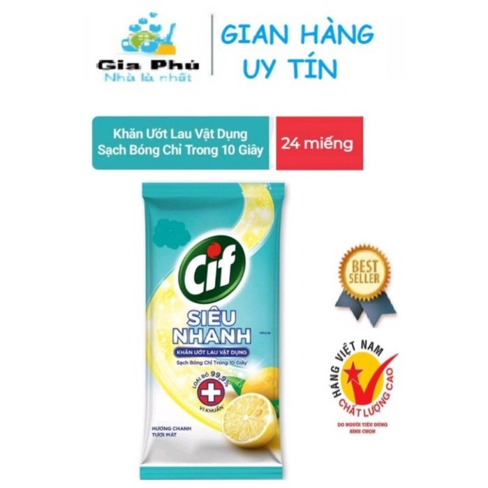 Khăn Ướt Lau Vật Dụng Cif Siêu Nhanh sẽ giúp bạn vệ sinh các vật dụng trong nhà thật hiệu quả và tiện lợi, đem lại vẻ sạch bóng như mới và loại bỏ 99,9% vi khuẩn* cho các bề mặt một cách nhanh chóng, với hương chanh tươi thơm mát. Vệ sinh nhà cửa hiệu quả & tiện lợi: Dễ dàng loại bỏ các vết bẩn, vết ố, bụi bám chỉ sau 1 lần sử dụng Làm sạch trên nhiều bề mặt & vật dụng: Sản phẩm hoạt động hiệu quả trên nhiều bề mặt & vật dụng: tay nắm cửa, công tắc, bếp từ, máy hút mùi, điều khiển từ xa, máy lạnh, bàn ghế,... Loại bỏ 99,9% vi khuẩn*: Với công thức Benzalkonium Chlorine có khả năng loại bỏ 99,9% vi khuẩn*, được viện Pasteur TP.HCM Kiểm Nghiệm và chứng nhận Hương chanh tươi thơm mát Với hương thơm nhẹ nhàng, sản phẩm mang lại cảm giác thoải mái, dễ chịu cho người sử dụng. Hướng dẫn sử dụng: Mở miếng nhãn dán theo hướng dẫn Lấy khăn và sử dụng Không cần lau lại bằng khăn ướt hoặc khăn khô Dán nhãn lại sau khi sử dụngGiá BHAT
