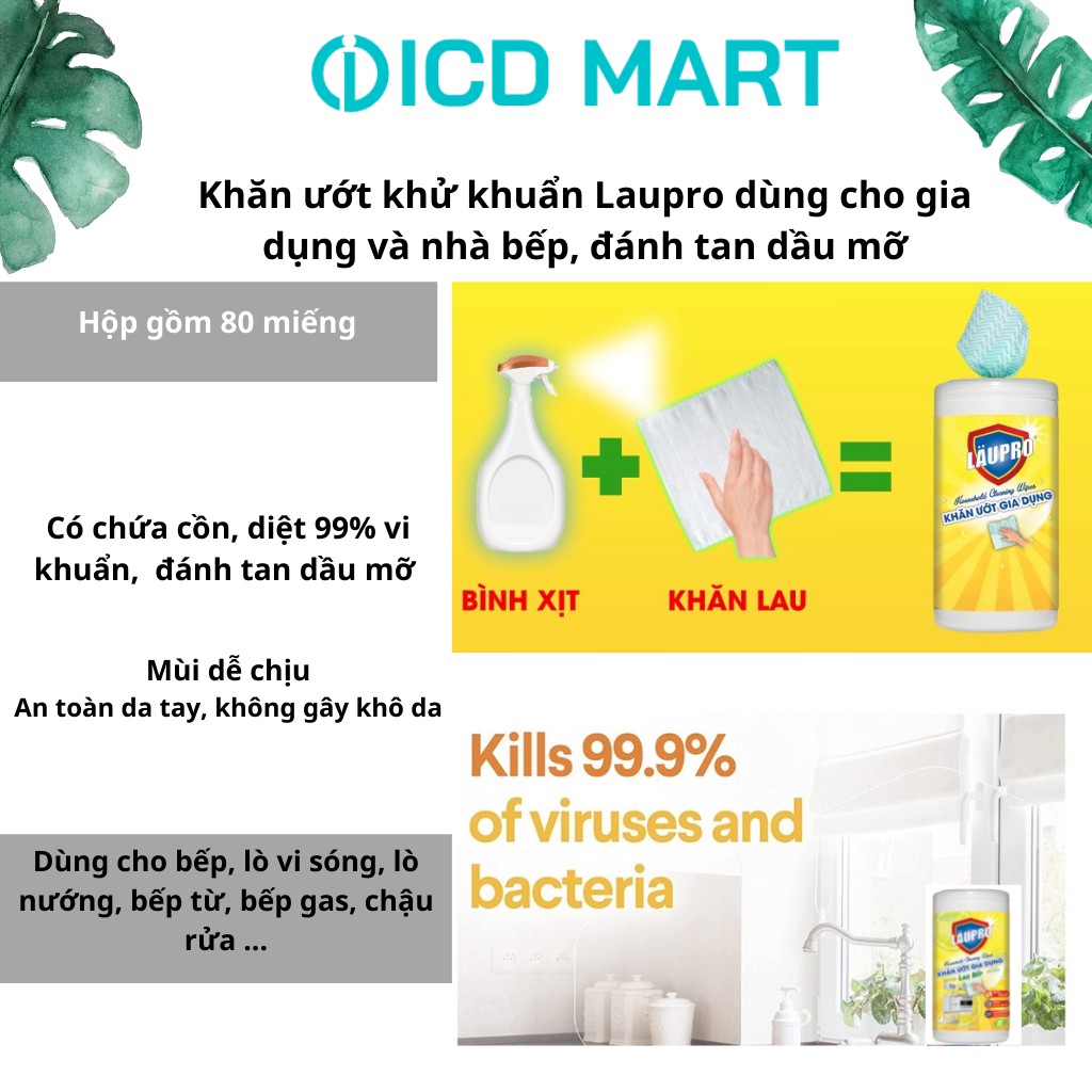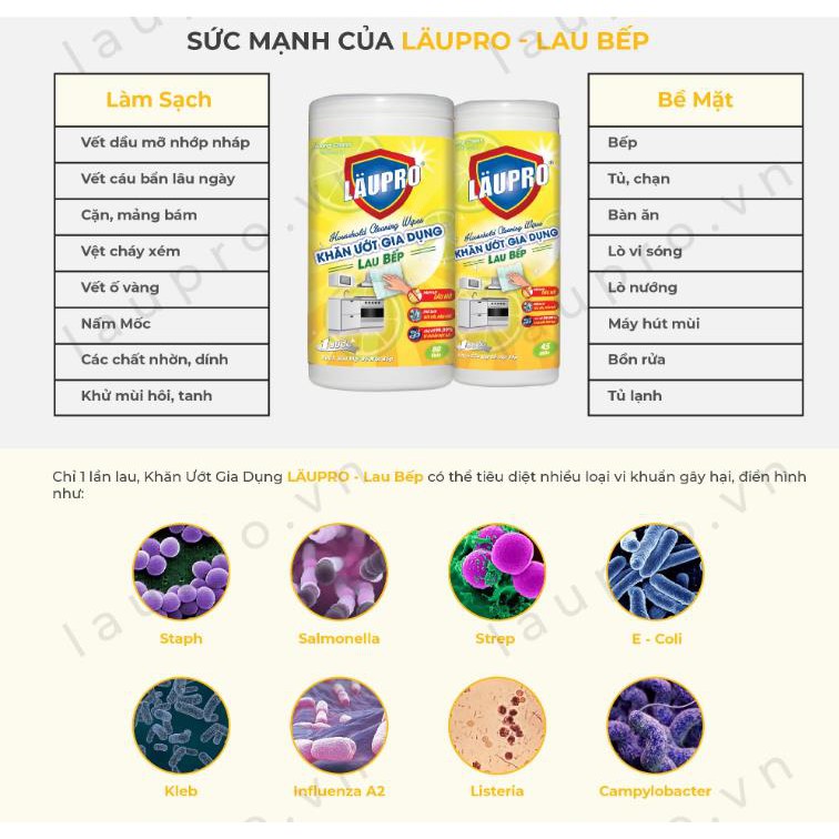 Giới thiệu Khăn Ướt Laupro diệt VI KHUẨN, có CHỨA CỒN, vệ sinh nhà cửa và vệ sinh bếp