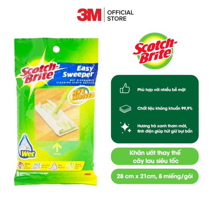 Giới thiệu Khăn ướt thay thế cây lau siêu tốc Scotch Brite 3M, 28 cm x 21cm, 8 miếng/gói, kháng khuẩn 99,9%, hương trà xanh