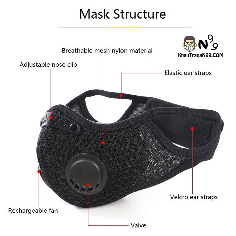 Chất liệu: Khẩu trang vải mesh + bộ lọc than hoạt tính + quạt nhựa ABS
