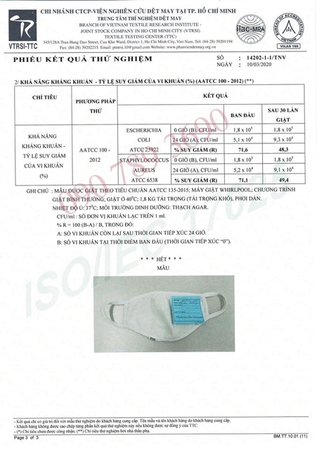 - Phiếu kết quả thử nghiệm kháng khuẩn do Viện nghiên cứu dệt may kiểm chứng.