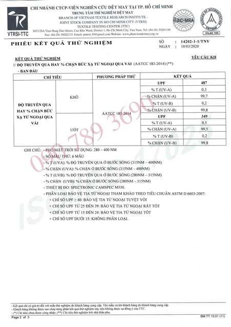 - Viện Nghiên cứu Dệt May chứng nhận Khả năng Kháng khuẩn và Kháng bức xạ UV số 14202 -1/TNV