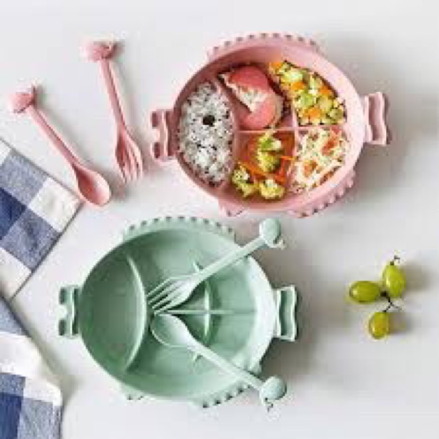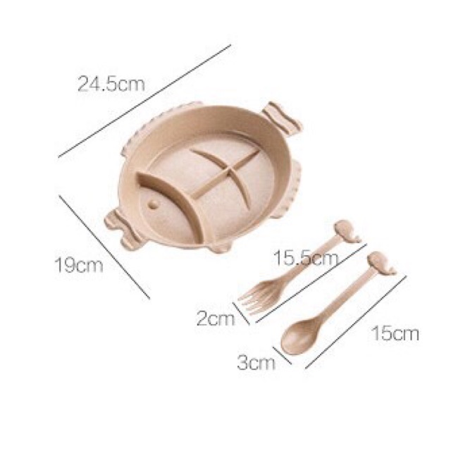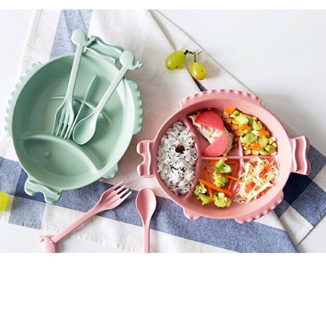 Bộ khay ăn hình cá kèm muỗng, nĩa nhựa lúa mạch