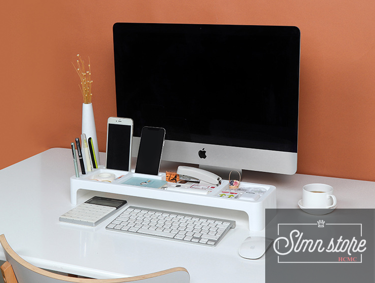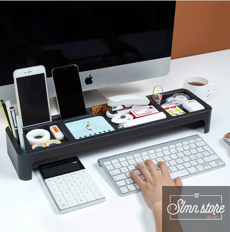 Thiết kế nhiều ngăn đựng: Máy tính, bút, sổ, giấy note, gôm, đồ bấm kim, kệ gác điện thoại….