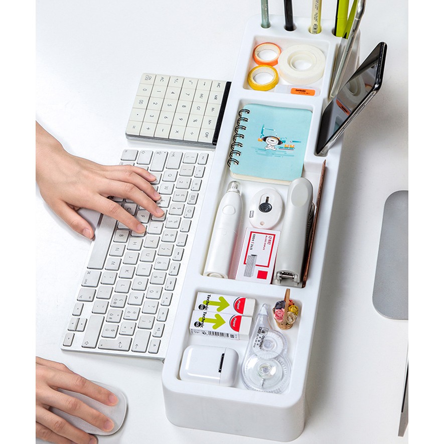 ❂ Thiết kế tích hợp nhiều ngăn, giúp nơi làm việc của bạn thêm phần sạch sẽ gọn gàng vì mọi thứ vật dụng đã được sắp xếp ngăn nắp trên khay bàn phím.❂ Thiết kế nhiều ngăn đựng: Máy tính, bút, sổ, giấy note, gôm, đồ bấm kim, kệ gác điện thoại….