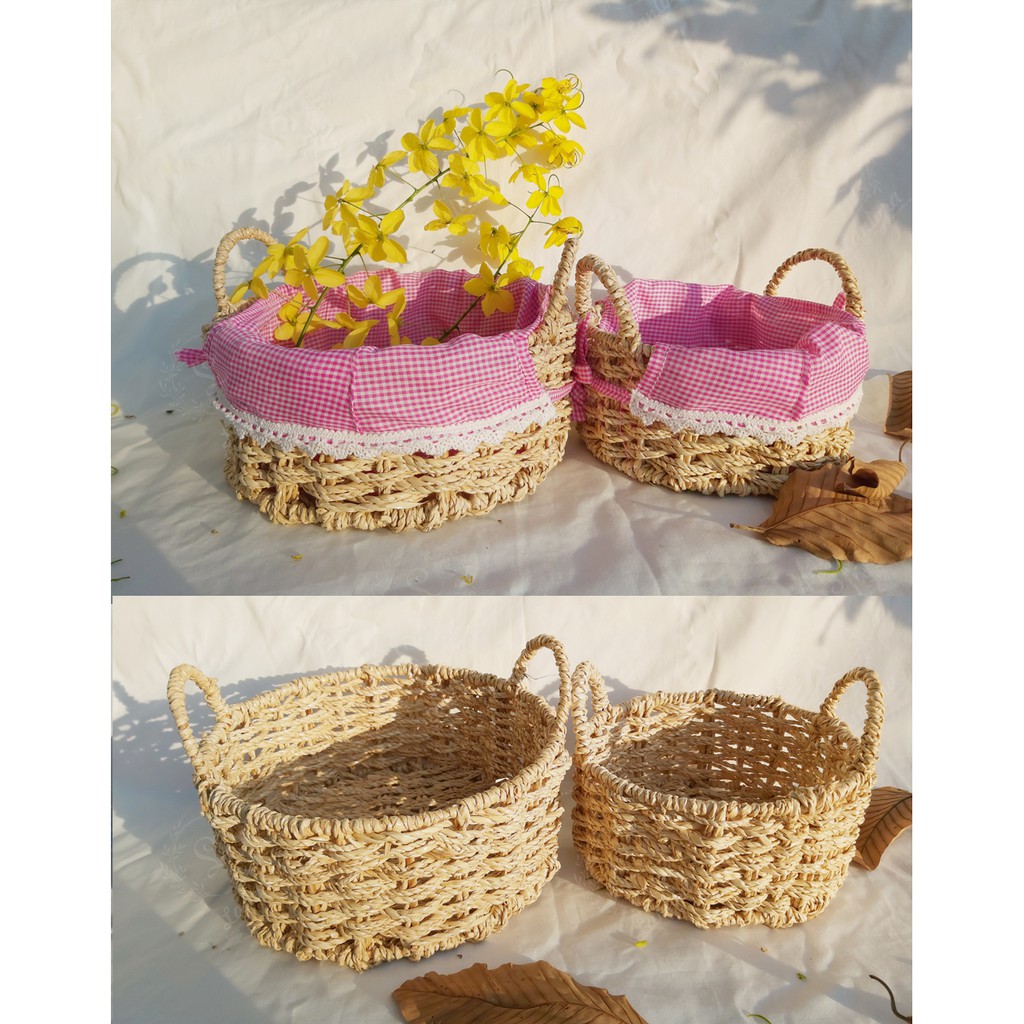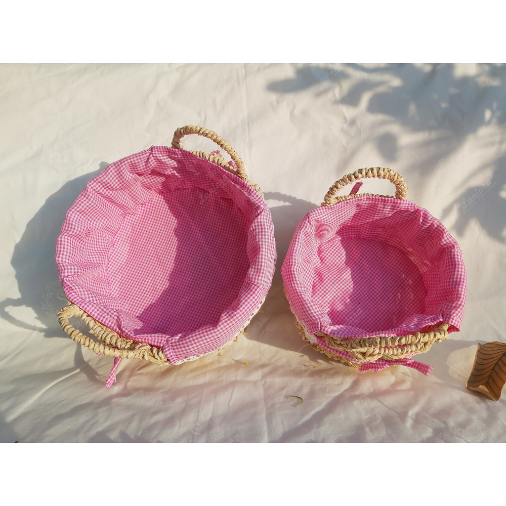 Khay cói trụ tròn có quai kèm vải lót hồng, giỏ đan từ sợi buông hàng VN, hình thật shop chụp
