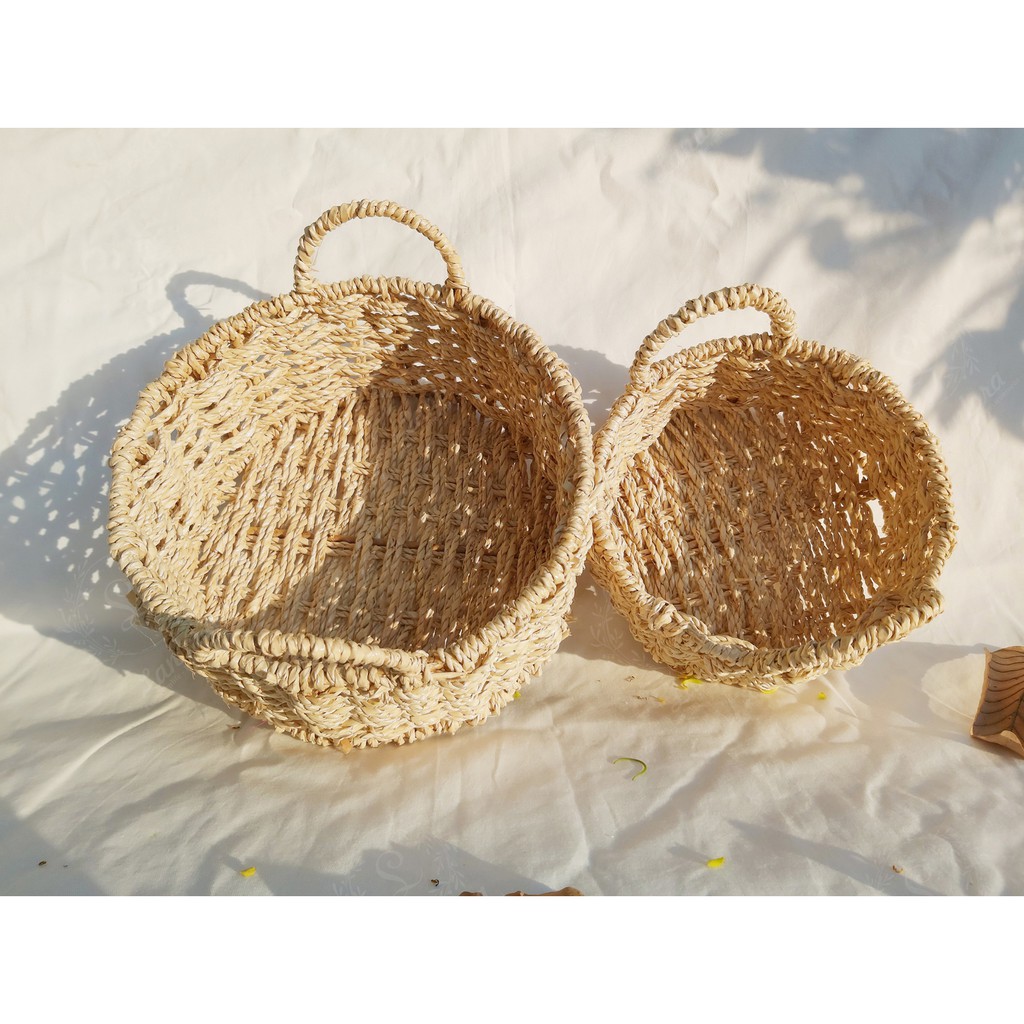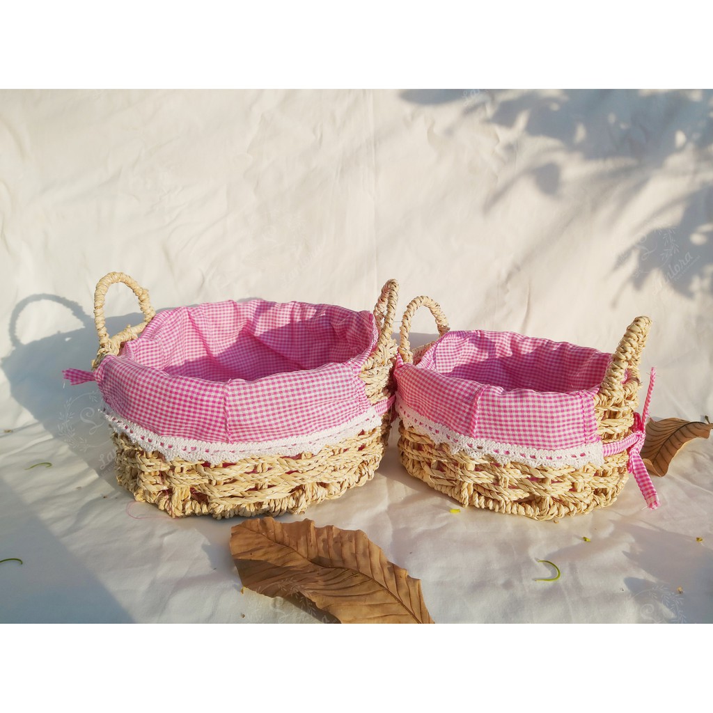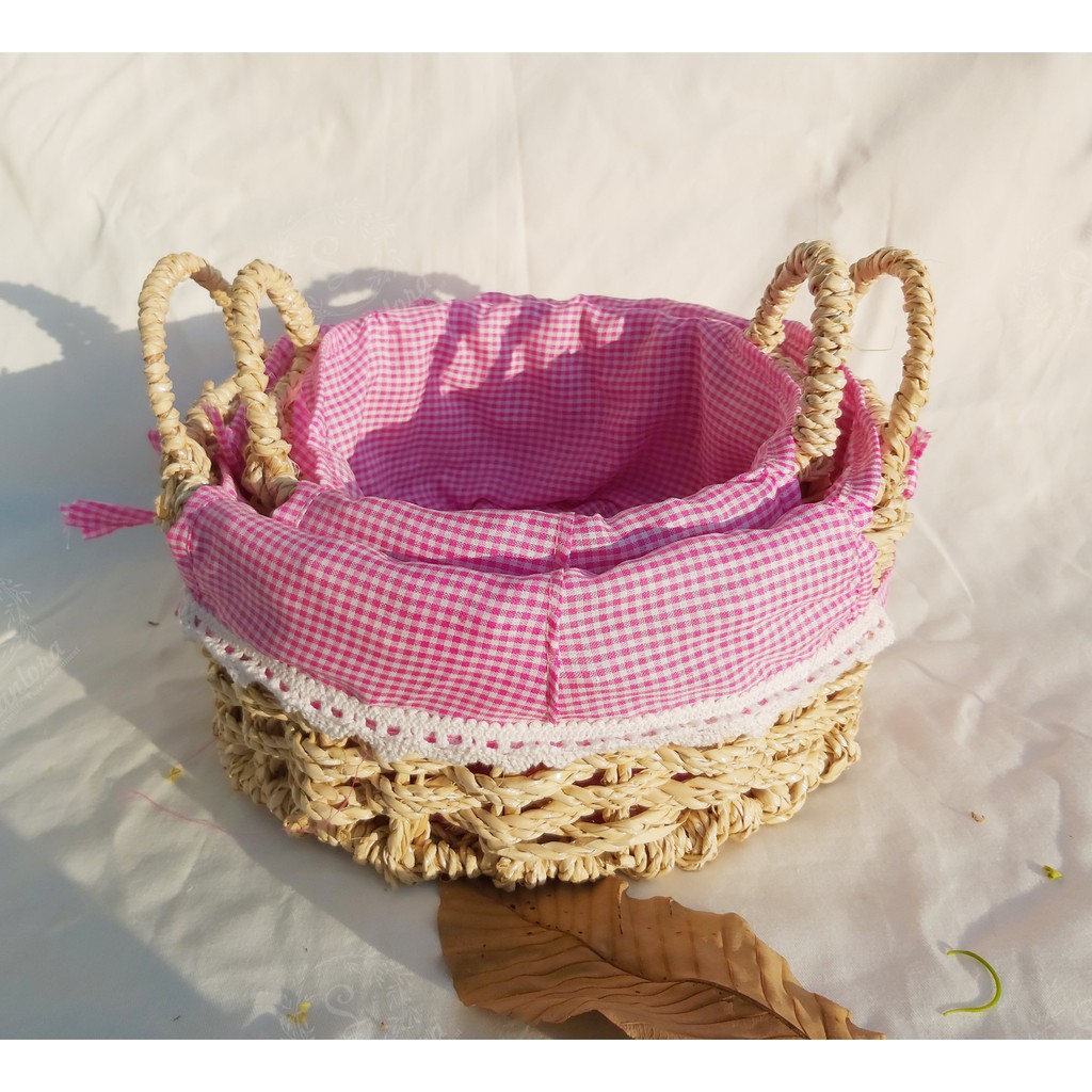 Giới thiệu Khay cói trụ tròn có quai kèm vải lót hồng, giỏ đan từ sợi buông hàng VN, hình thật shop chụp