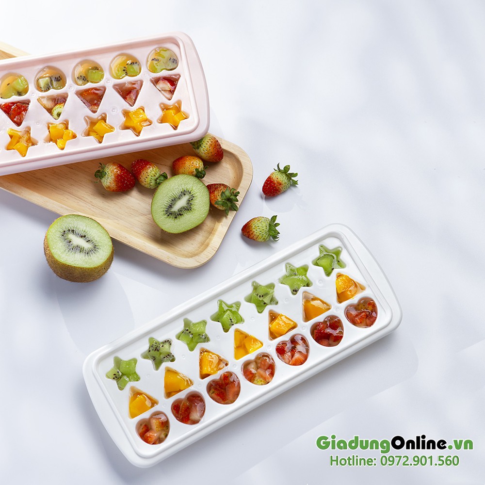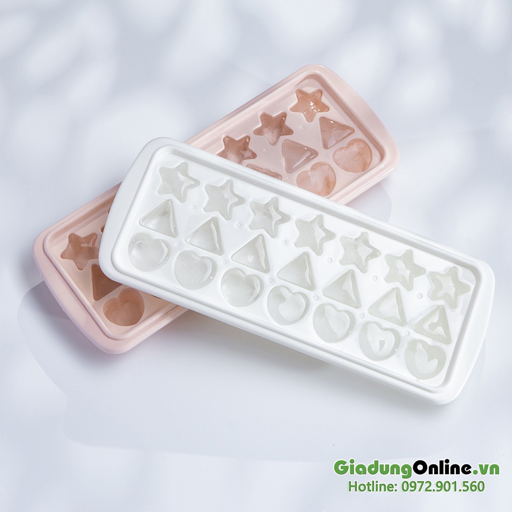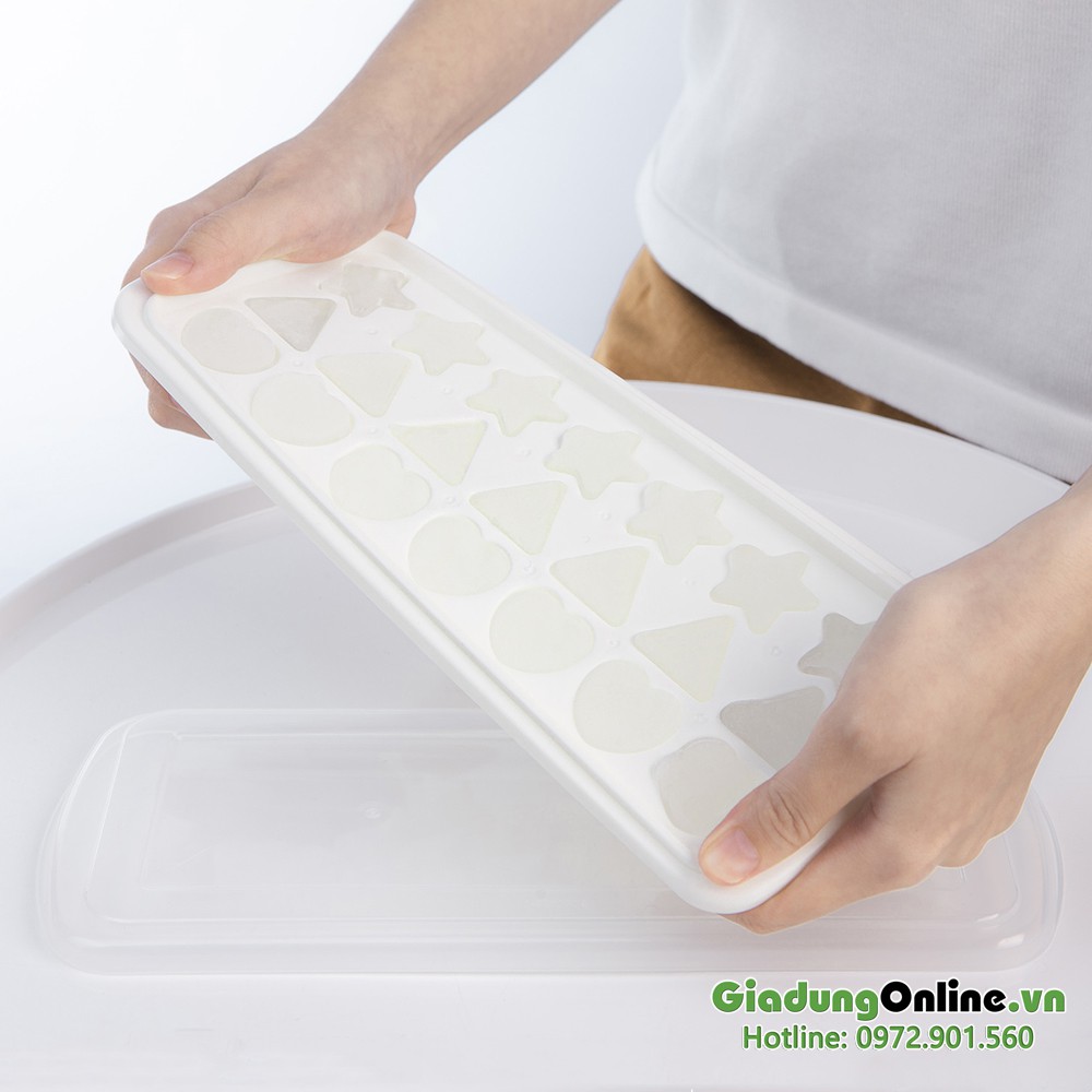 - Thân khay mềm, chia 21 ngăn, giúp dễ dàng lấy đá/thạch (có nắp đậy)
